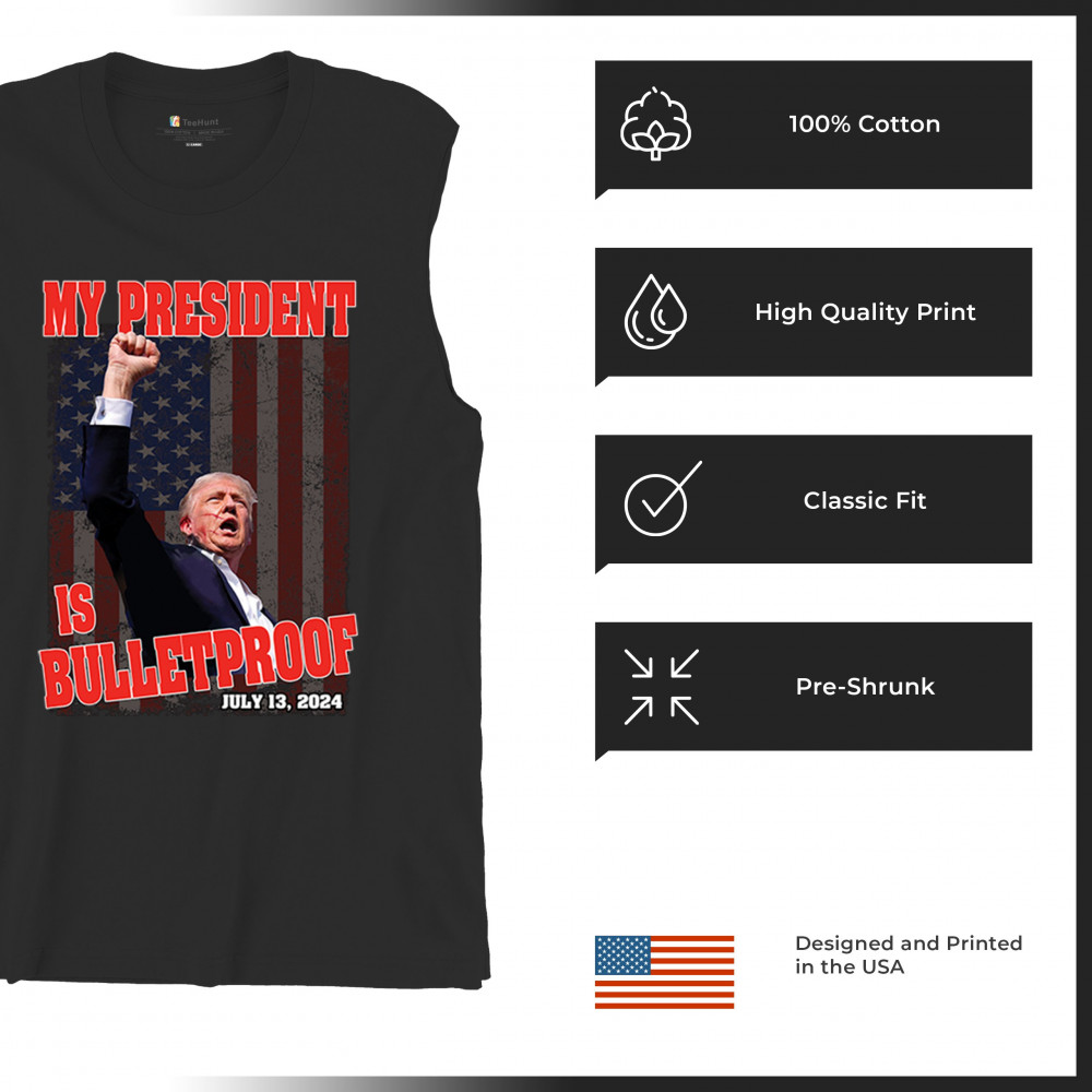 Support Trump with our "My President is Bulletproof" design, perfect for rallies and everyday wear. Show your patriotic pride and conservative values.