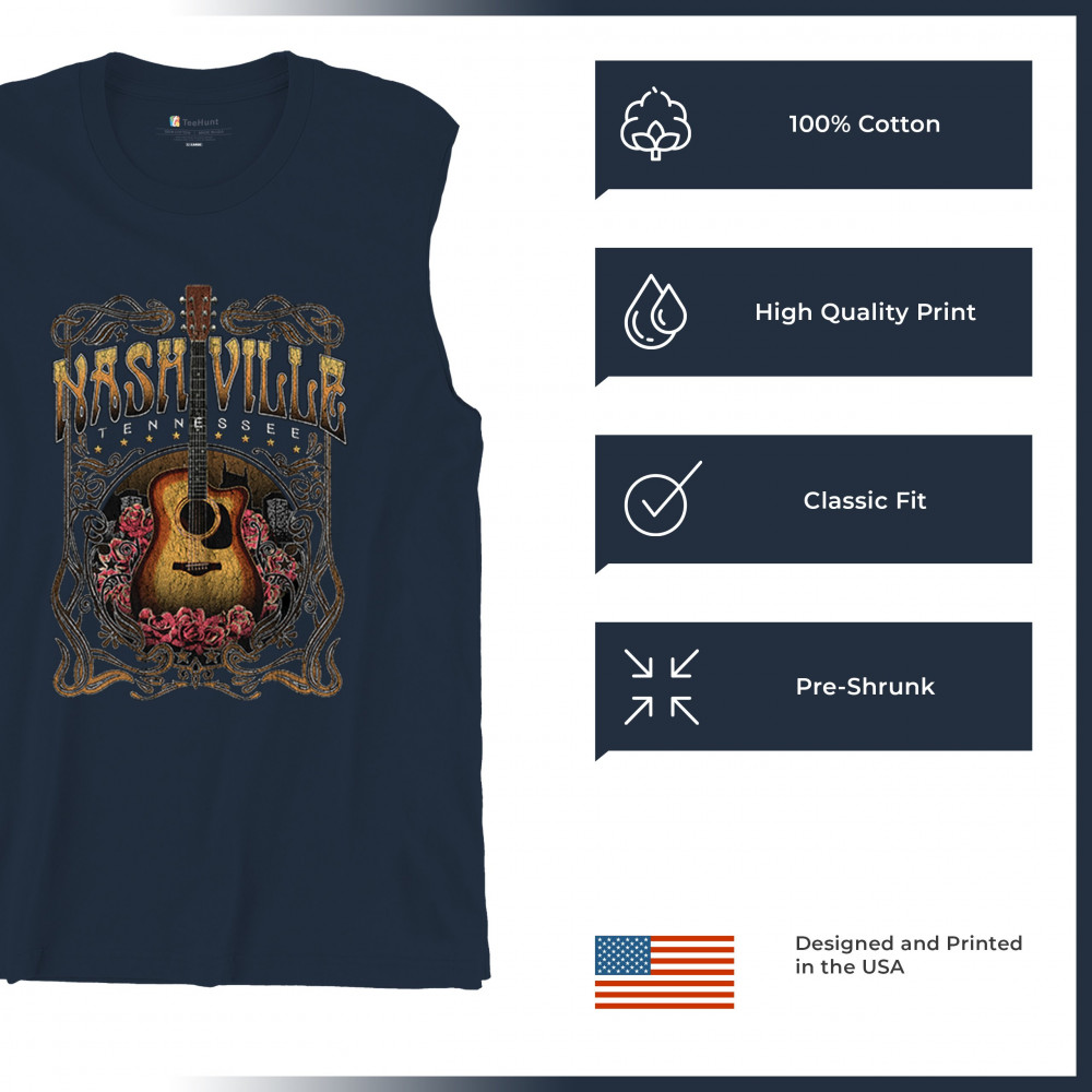 Vintage Nashville Tennessee design with rustic guitar and roses. Great for concerts, country music fans, road trips, and souvenir wear.
