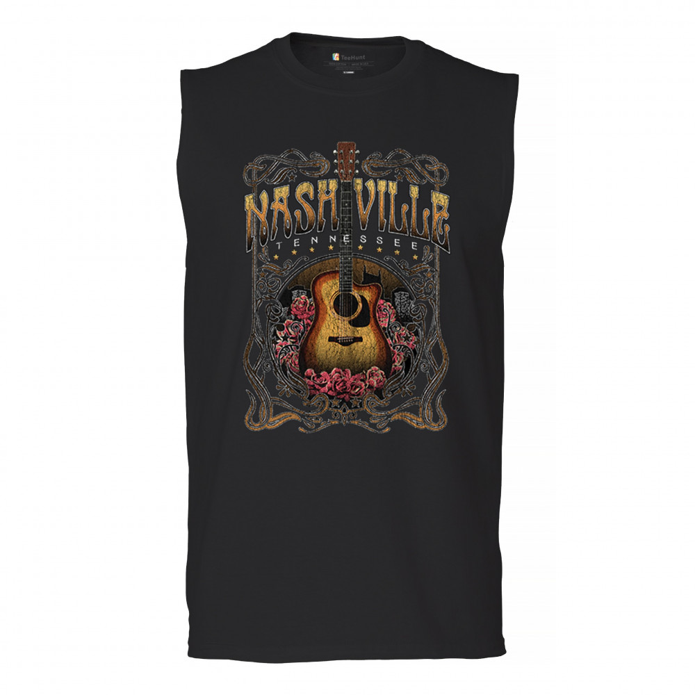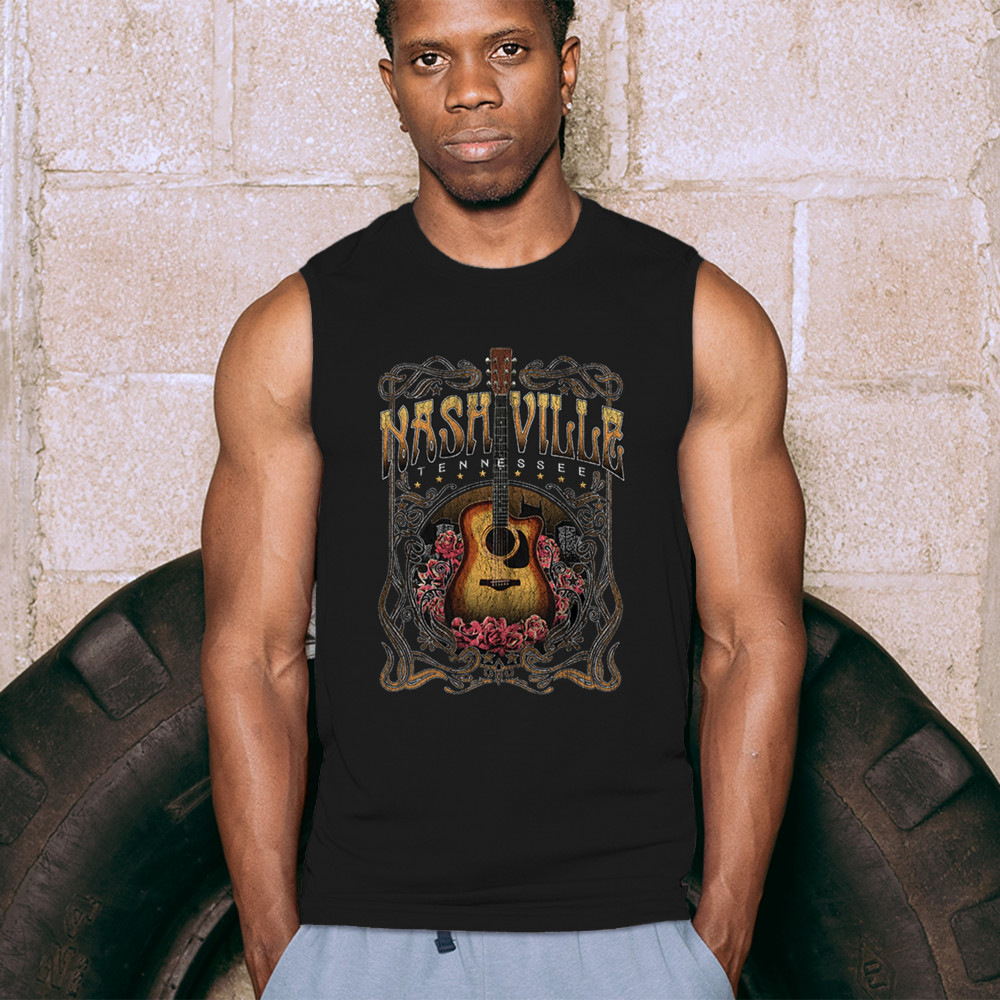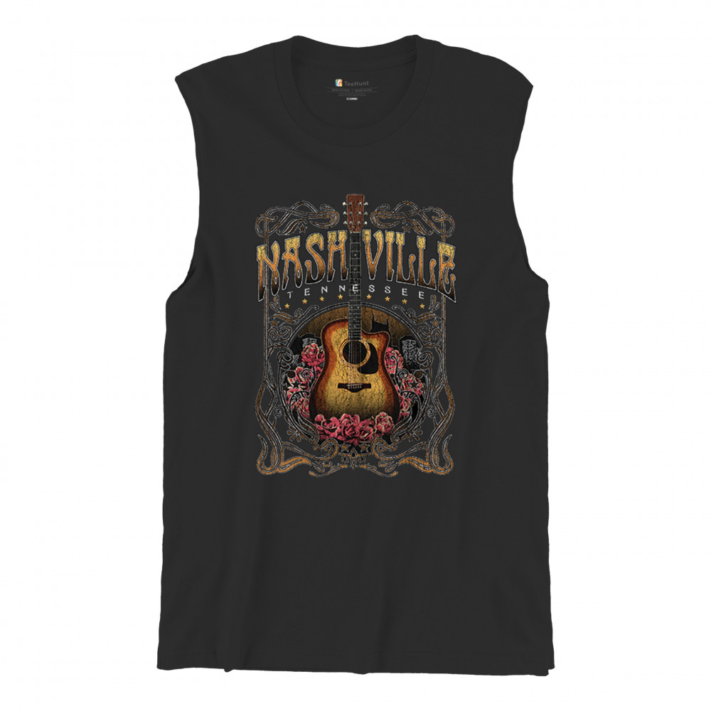 Vintage Nashville Tennessee design with rustic guitar and roses. Great for concerts, country music fans, road trips, and souvenir wear.