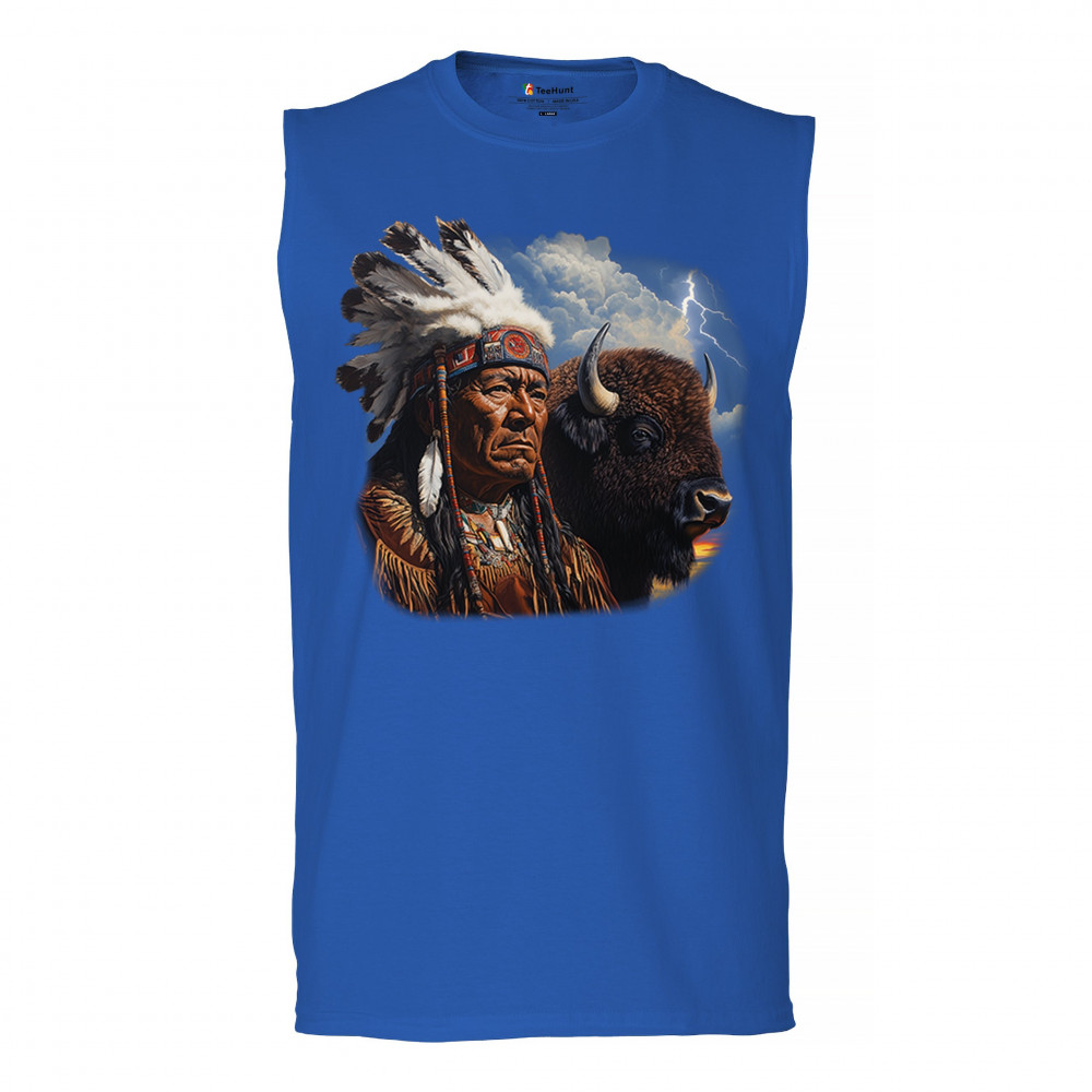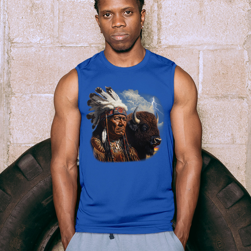 This powerful design features a Native American elder in traditional dress and feathered headdress beside a noble bison. Framed by a stormy sky and lightning, the art symbolizes tribal pride, spiritual harmony, ancestral strength, and a deep connection to nature’s raw energy.