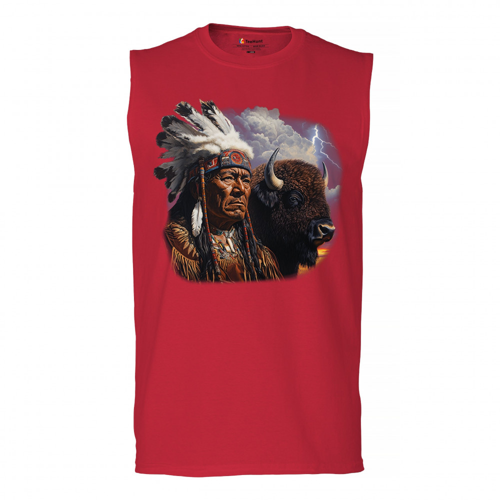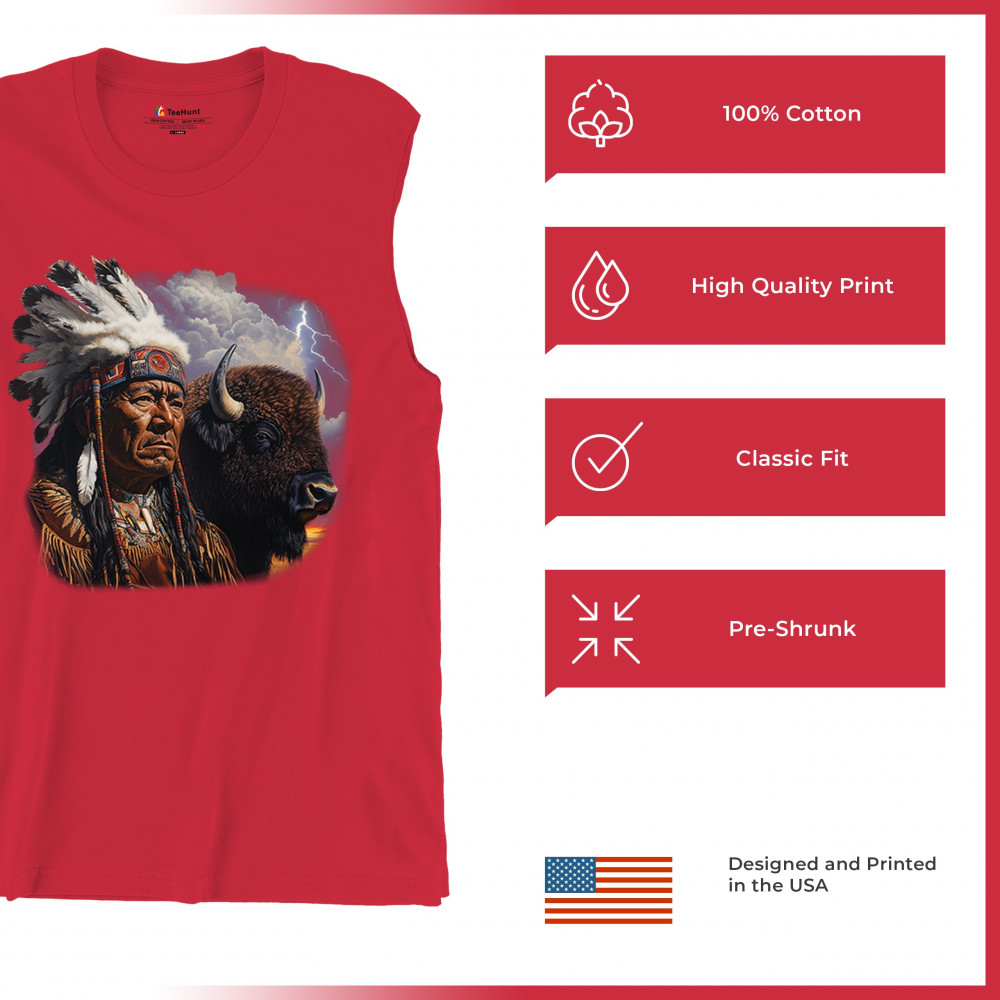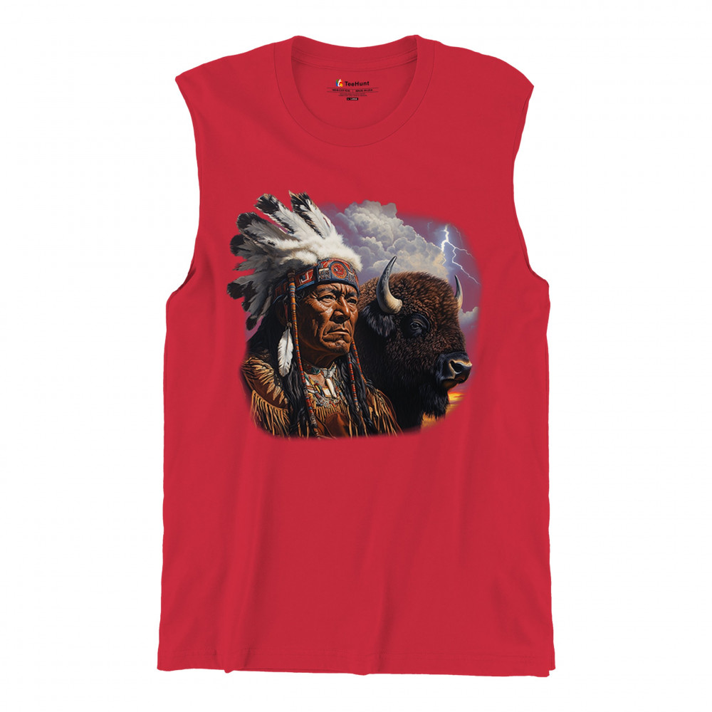 This powerful design features a Native American elder in traditional dress and feathered headdress beside a noble bison. Framed by a stormy sky and lightning, the art symbolizes tribal pride, spiritual harmony, ancestral strength, and a deep connection to nature’s raw energy.