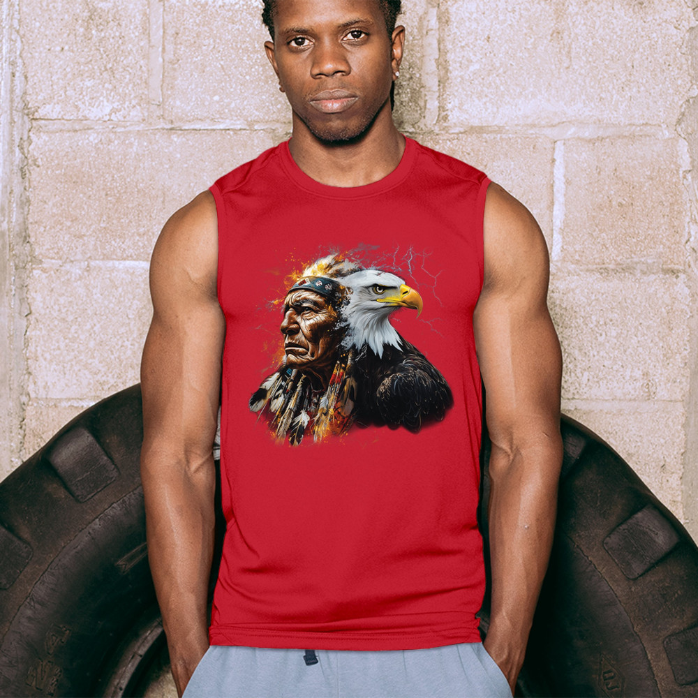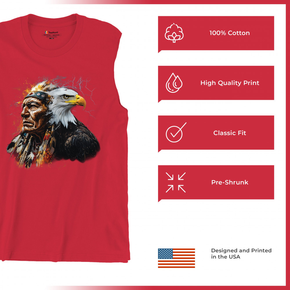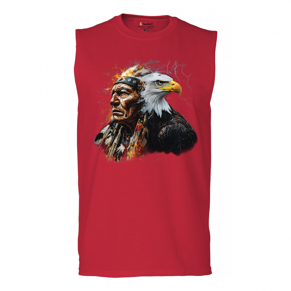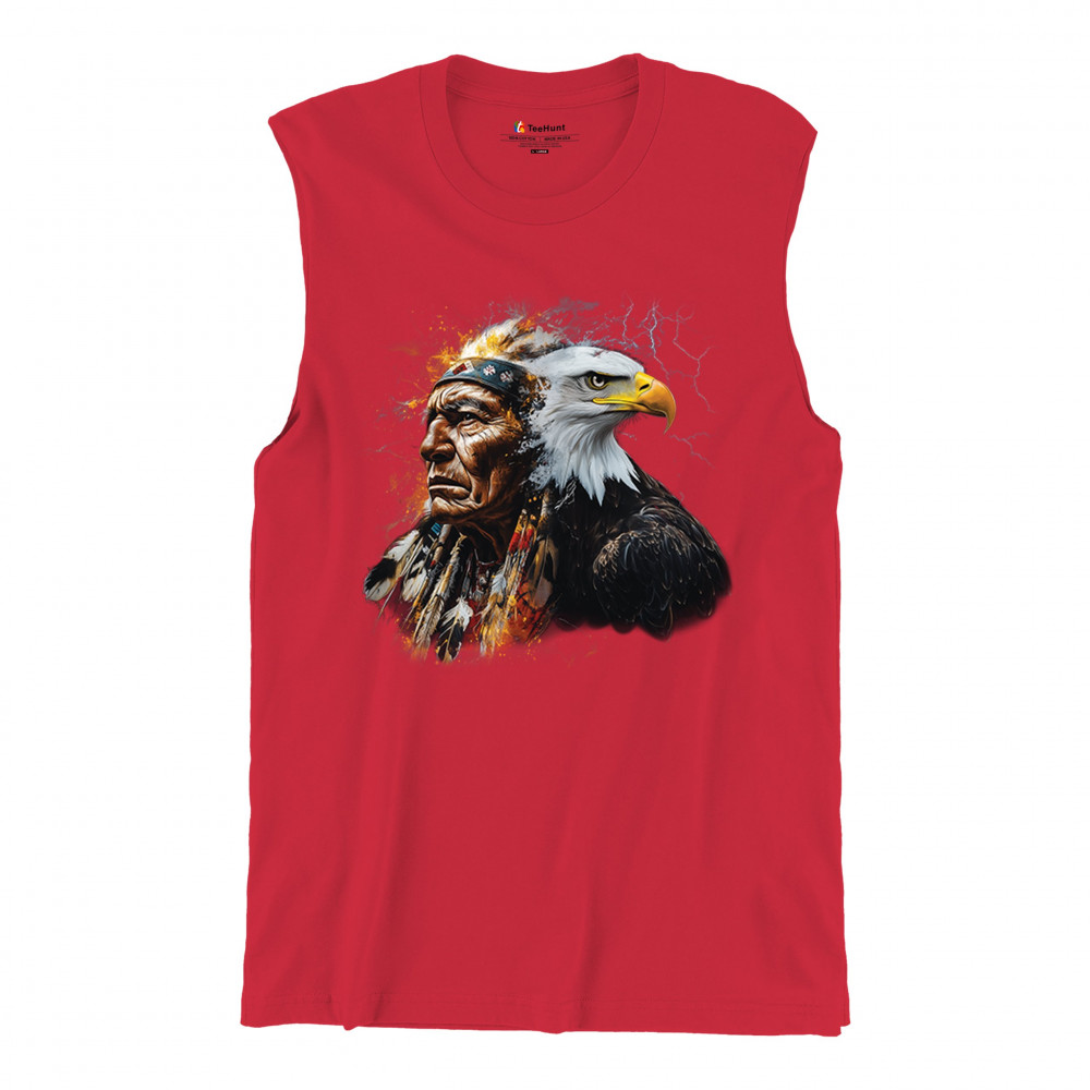 Bold tribal totem design with Native chief, eagle, lightning, and fire. A fierce blend of spirit, power, and cultural pride in one image.