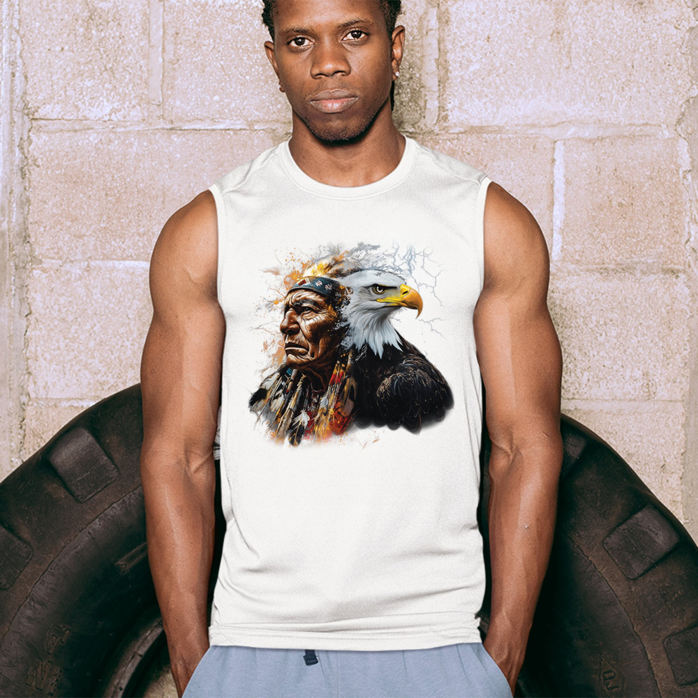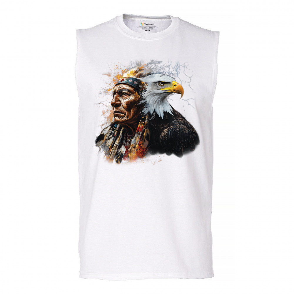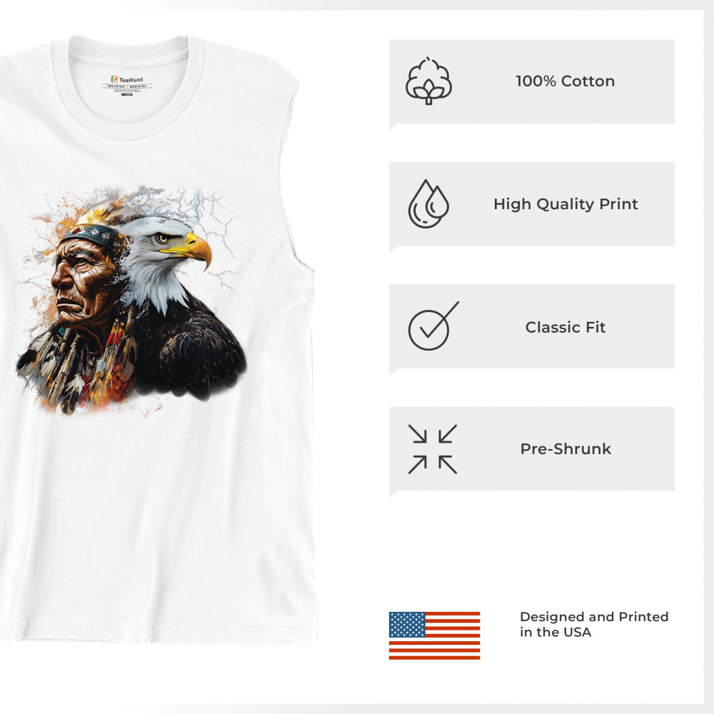 Bold tribal totem design with Native chief, eagle, lightning, and fire. A fierce blend of spirit, power, and cultural pride in one image.