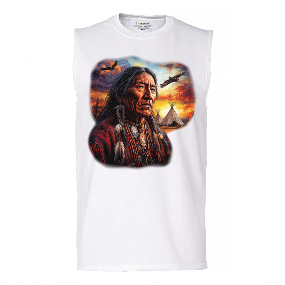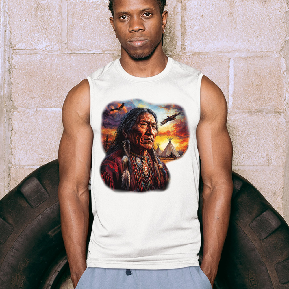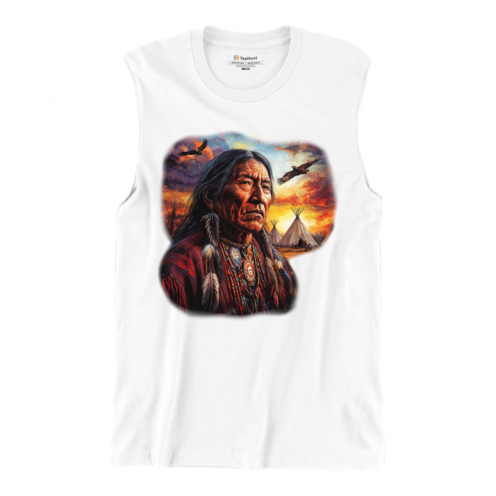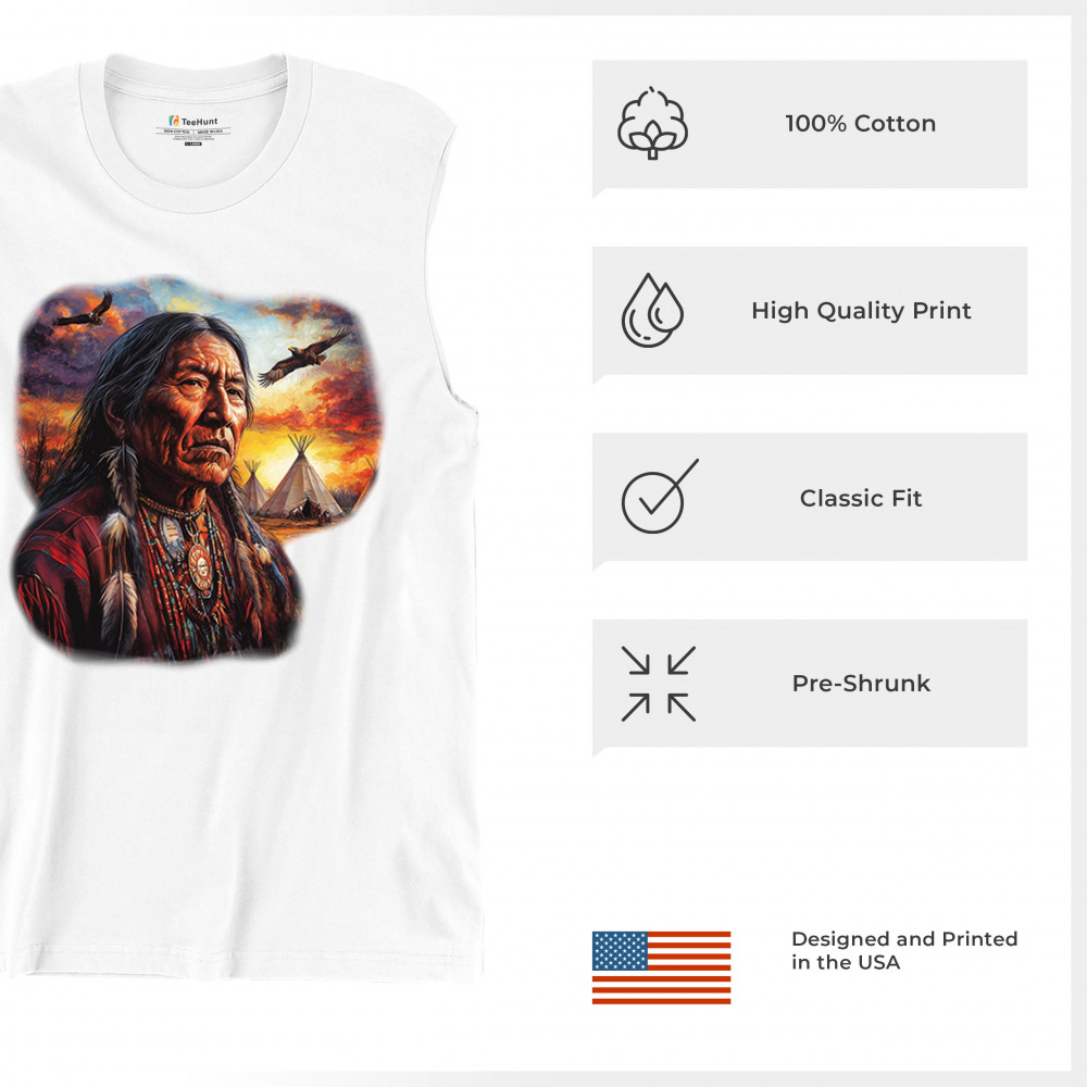 This vivid artwork features a Native American elder in traditional feathered attire, set before a blazing sunset with soaring eagles and peaceful teepees. The scene symbolizes strength, heritage, and spiritual wisdom. A heartfelt tribute to tribal pride, ancestral legacy, and cultural connection to land.