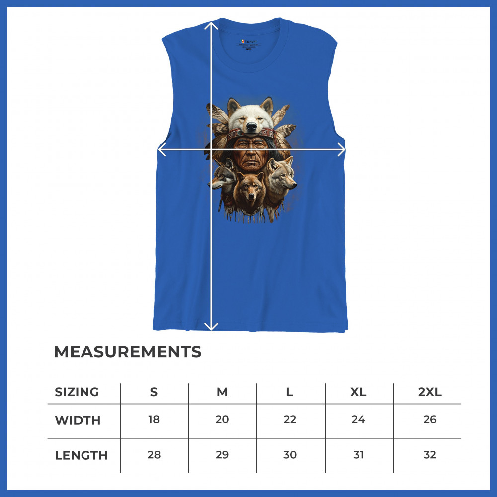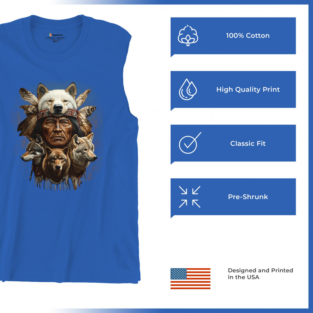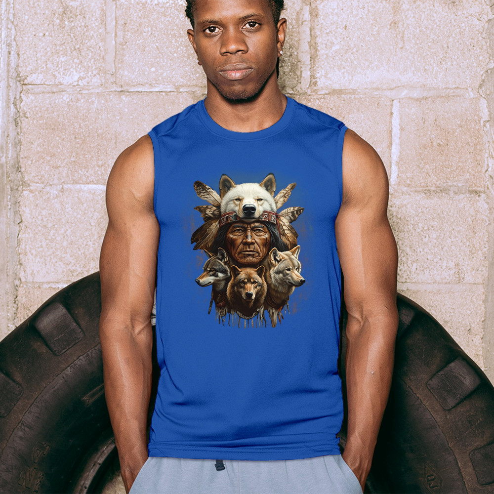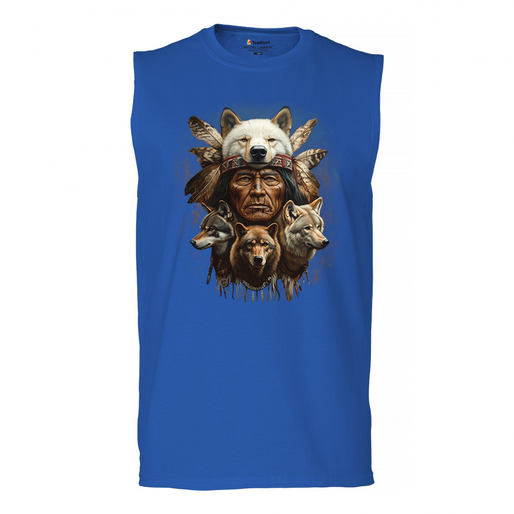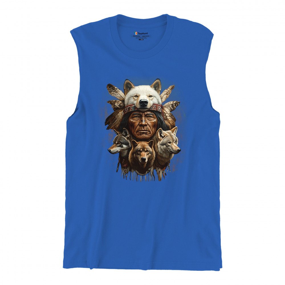 This spiritual tribal design showcases a Native American elder in a detailed wolf headdress surrounded by guardian wolves. It represents strength, loyalty, instinct, and sacred unity with nature. A powerful totem for honoring animal bonds, native pride, and ancestral spiritual guidance through the spirit of the wolf.