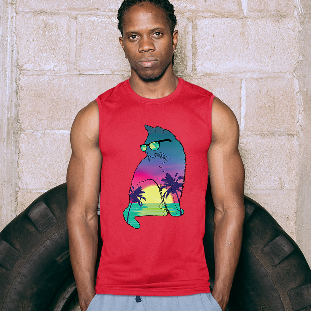 NEON CAT IN SUNGLASSES muscle shirt tropic kitten summer beach kitty men's red