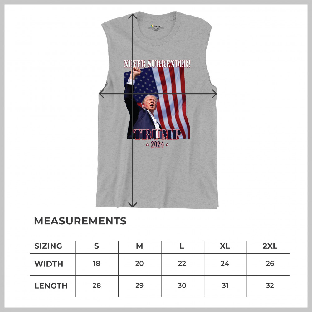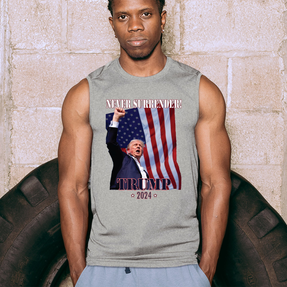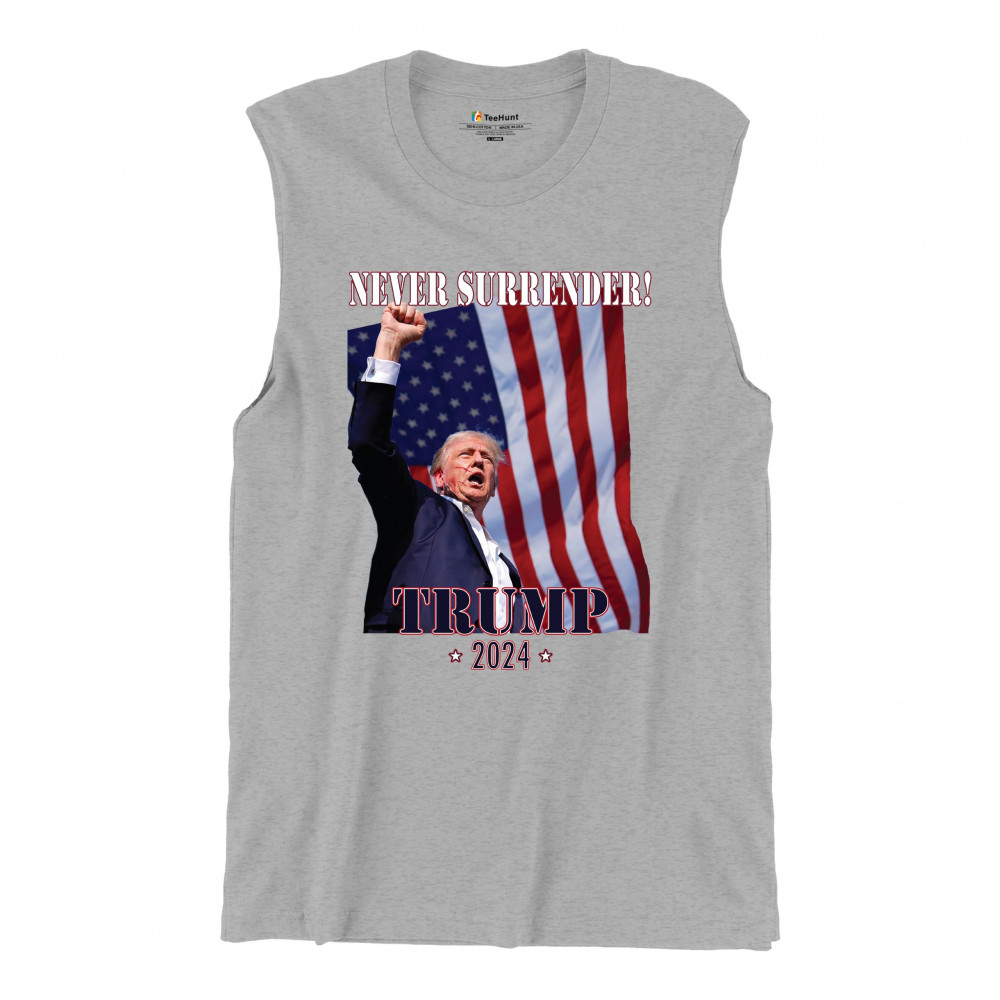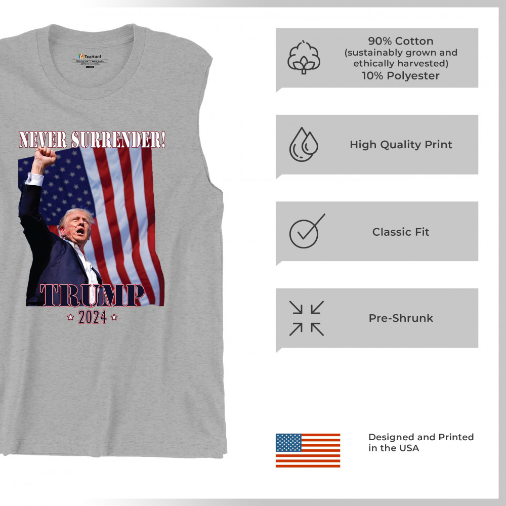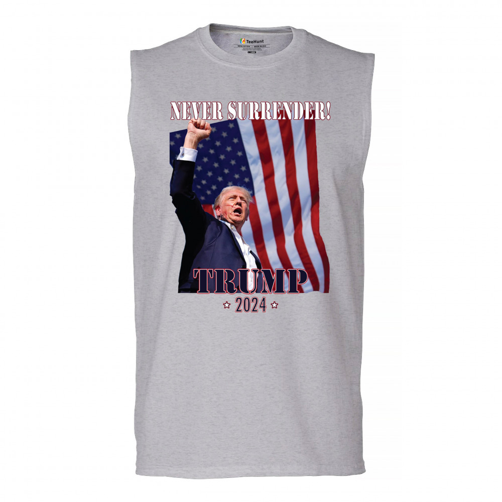 Celebrate your patriotic spirit and political stance with our "Never Surrender! Trump 2024" design. This powerful graphic showcases Donald Trump with a raised fist against the backdrop of the American flag, symbolizing resilience and determination. Ideal for rallies, events, and everyday wear, this design is crafted from premium materials for comfort and durability. Stand out and show your support for America's future with this striking and bold statement piece, perfect for any proud Trump supporter.