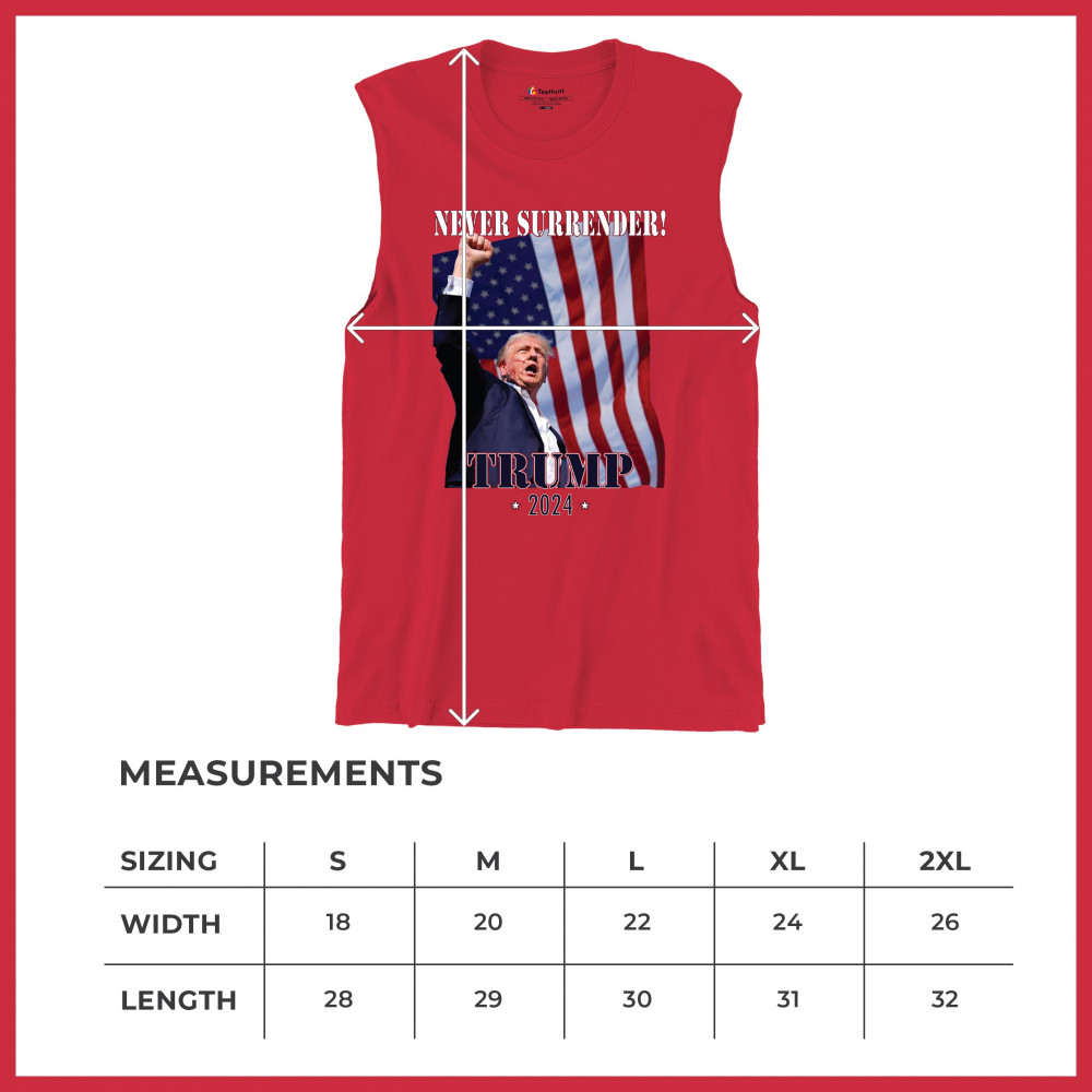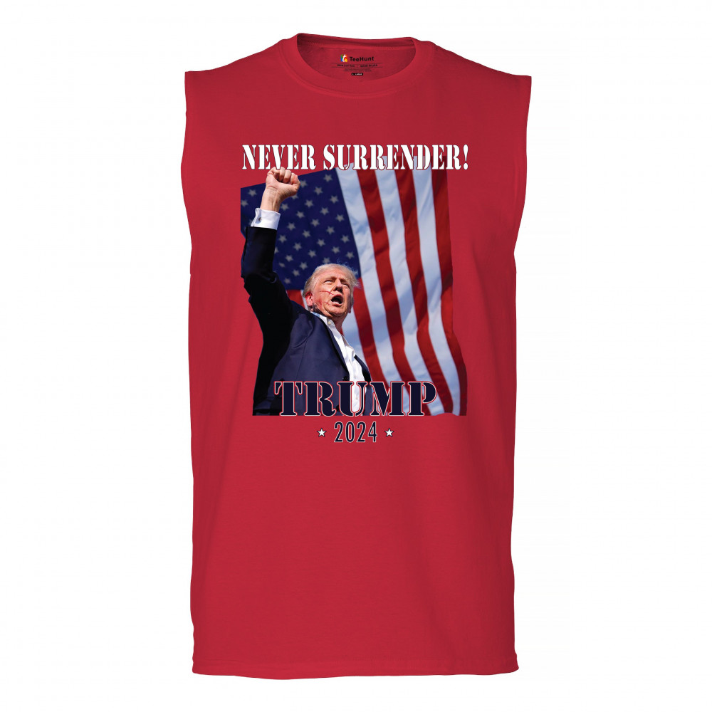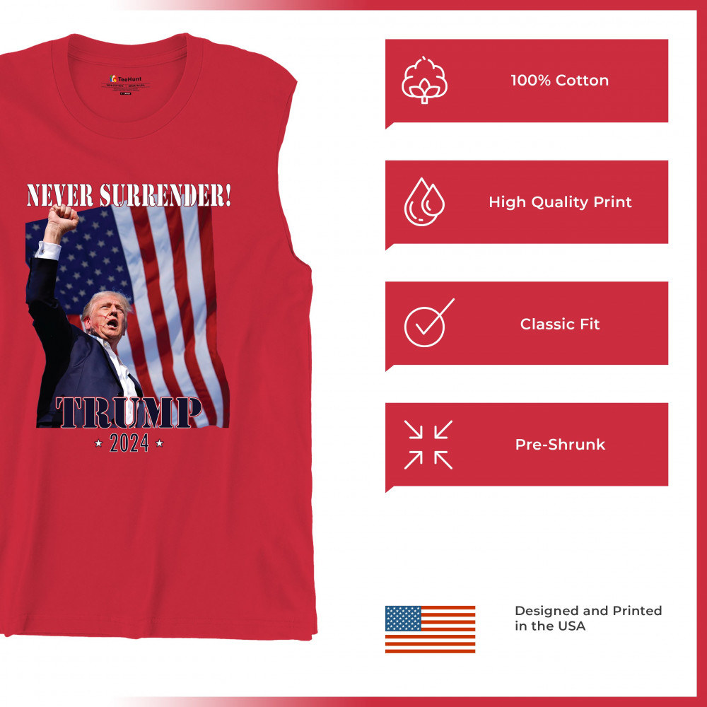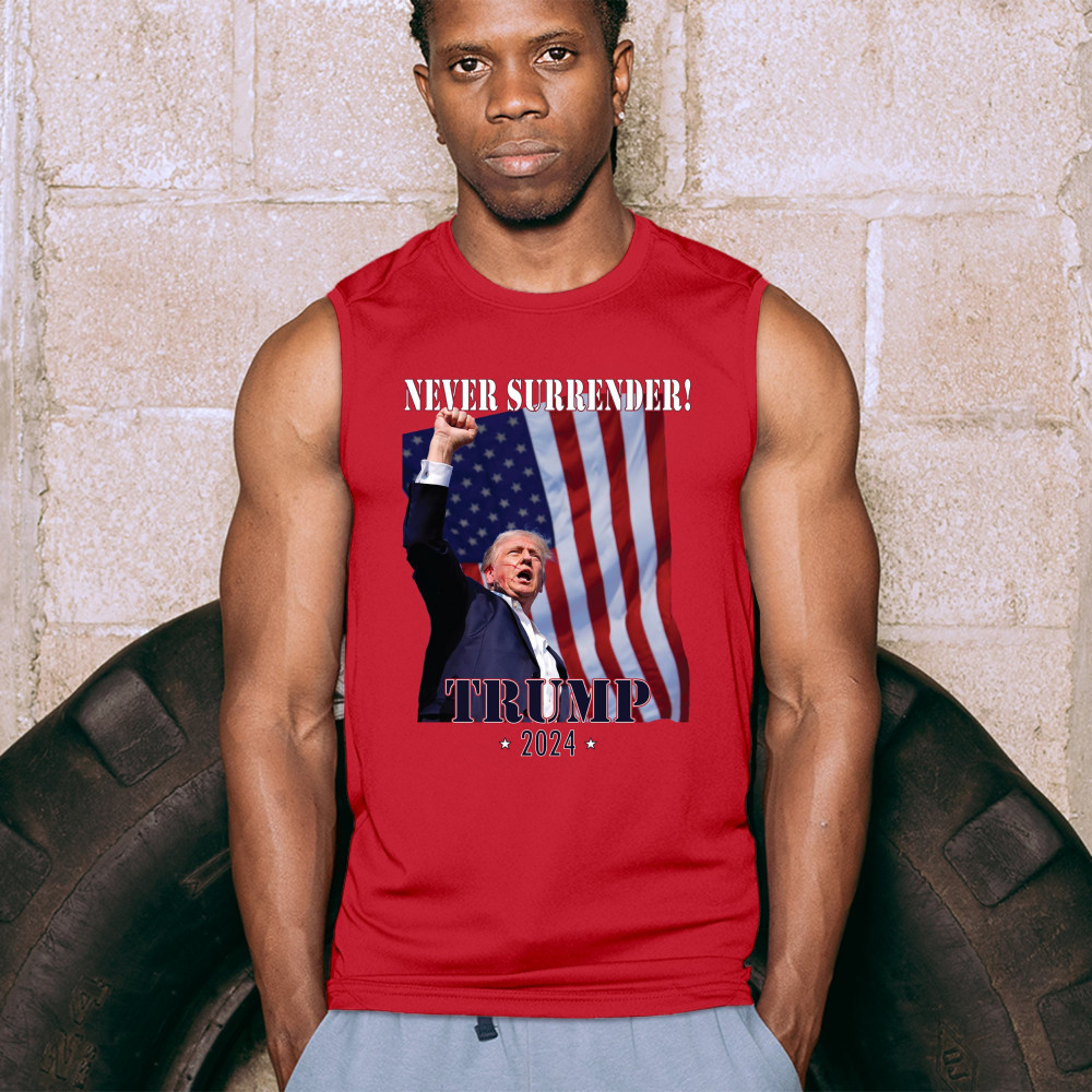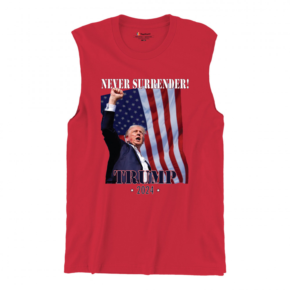 Celebrate your patriotic spirit and political stance with our "Never Surrender! Trump 2024" design. This powerful graphic showcases Donald Trump with a raised fist against the backdrop of the American flag, symbolizing resilience and determination. Ideal for rallies, events, and everyday wear, this design is crafted from premium materials for comfort and durability. Stand out and show your support for America's future with this striking and bold statement piece, perfect for any proud Trump supporter.