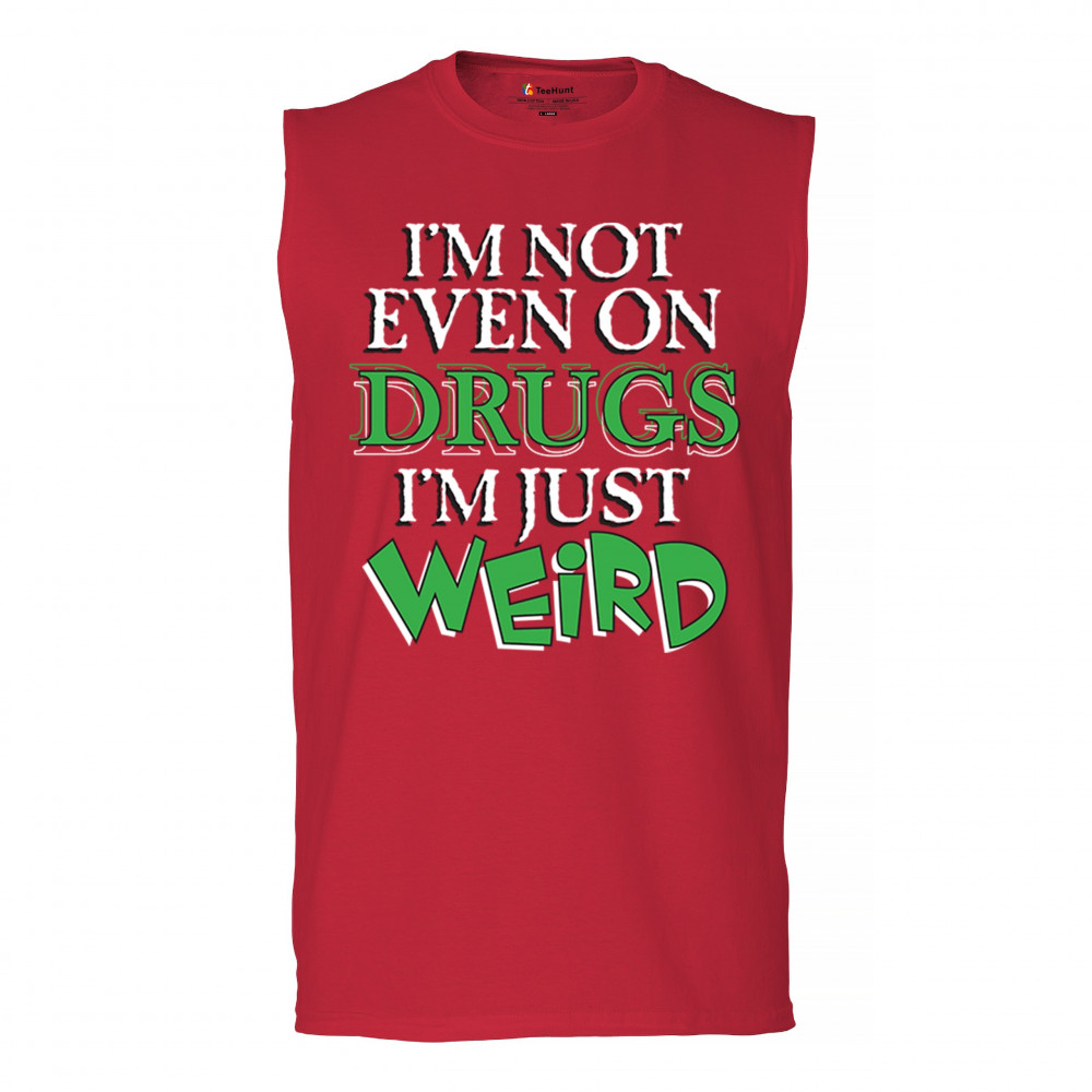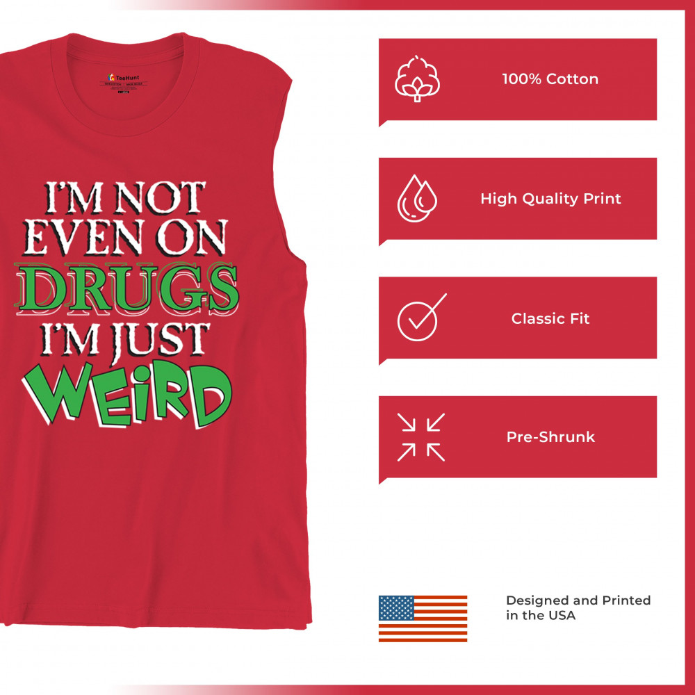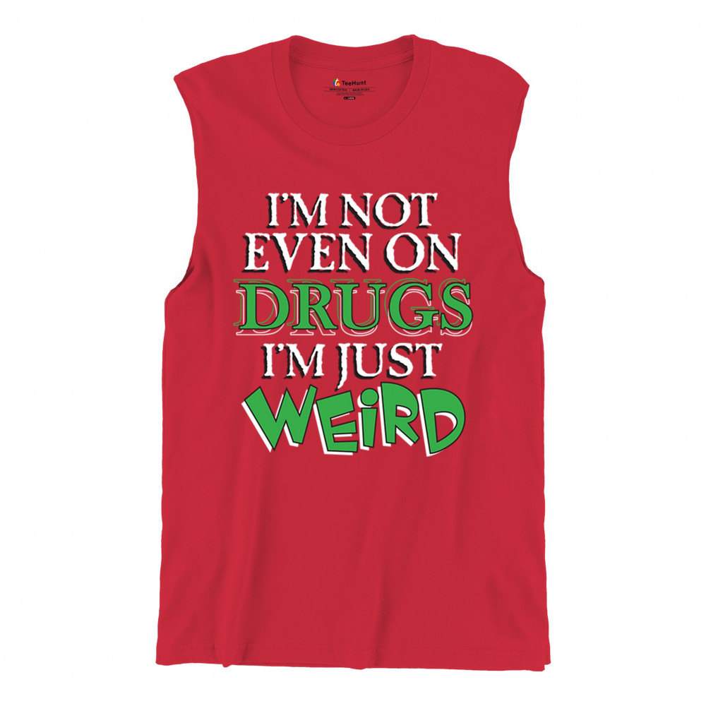 Bold weird design for introverts and quirky minds. Says “I'm not even on drugs I'm just weirdâ€â€”perfect for awkward humor and loud energy.