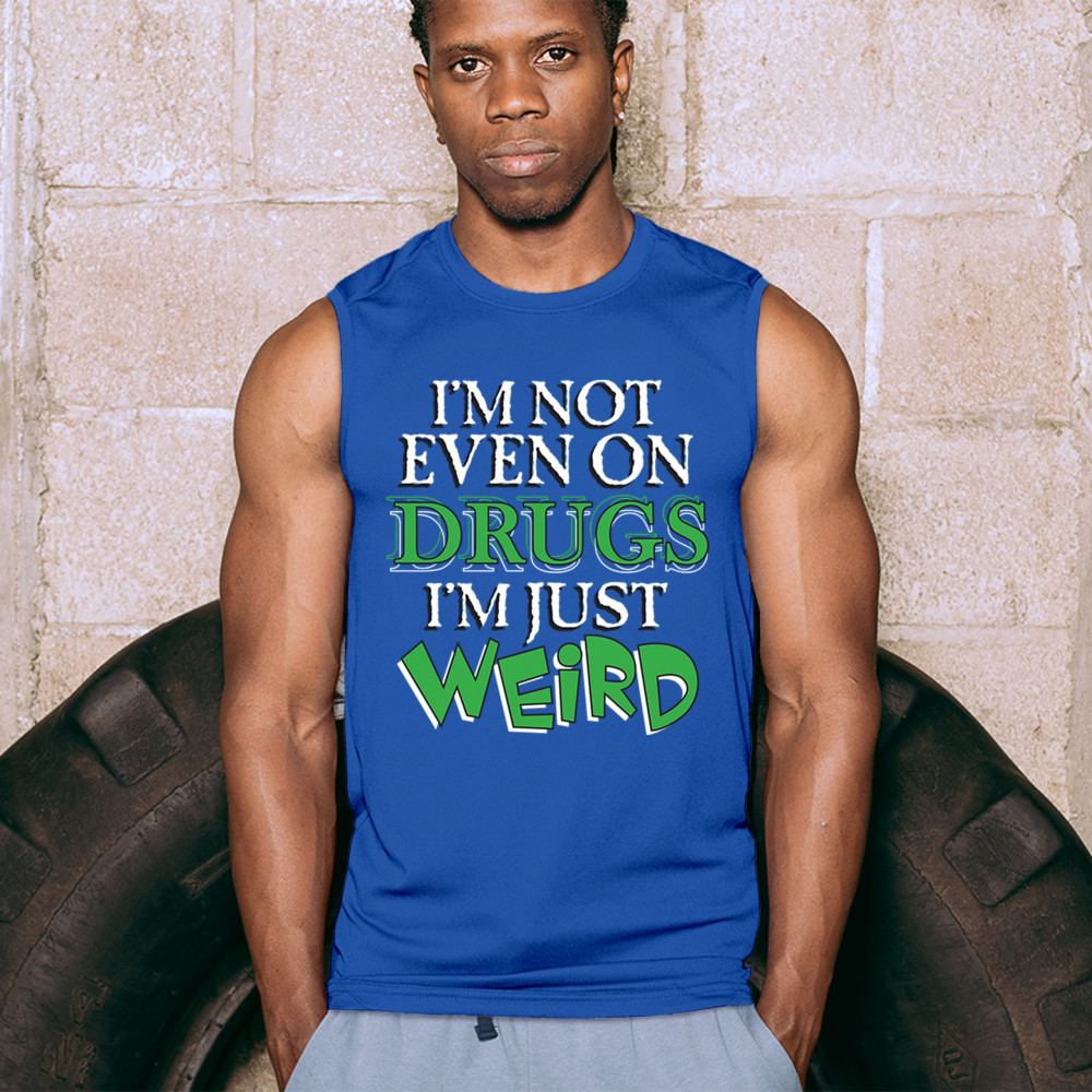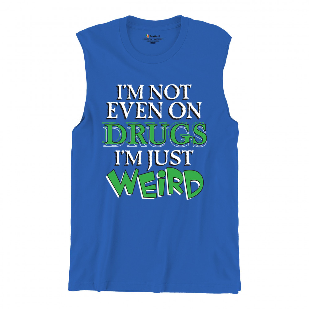 Bold weird design for introverts and quirky minds. Says “I'm not even on drugs I'm just weirdâ€â€”perfect for awkward humor and loud energy.