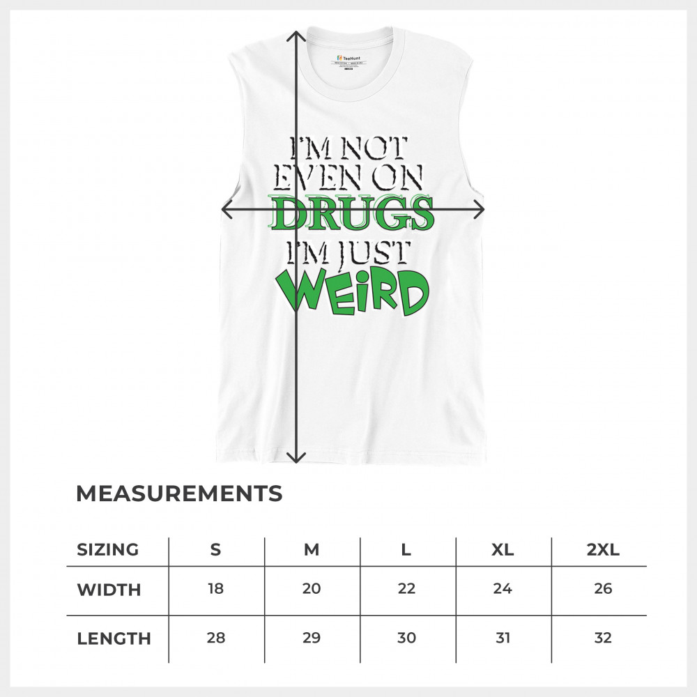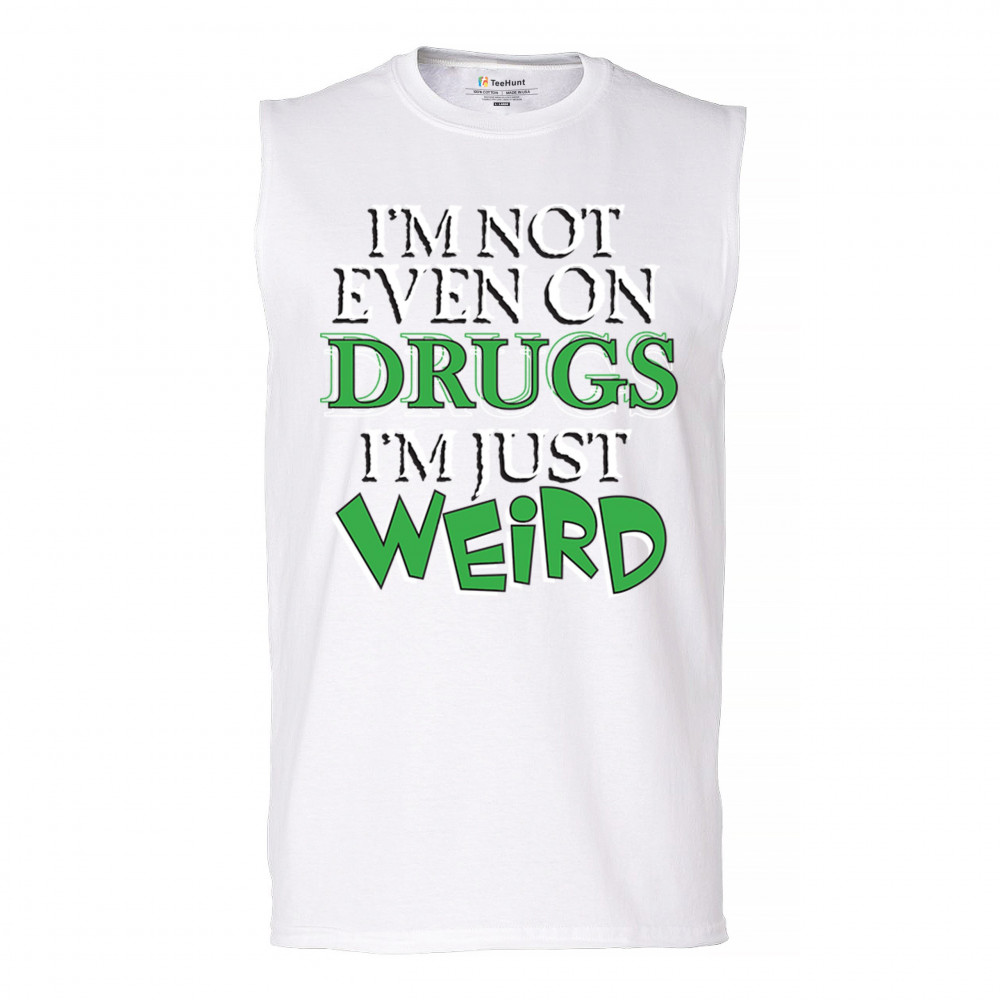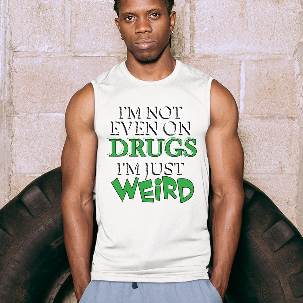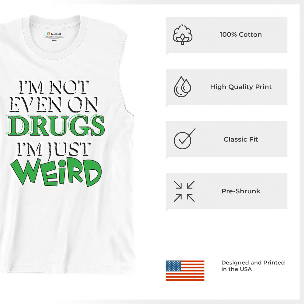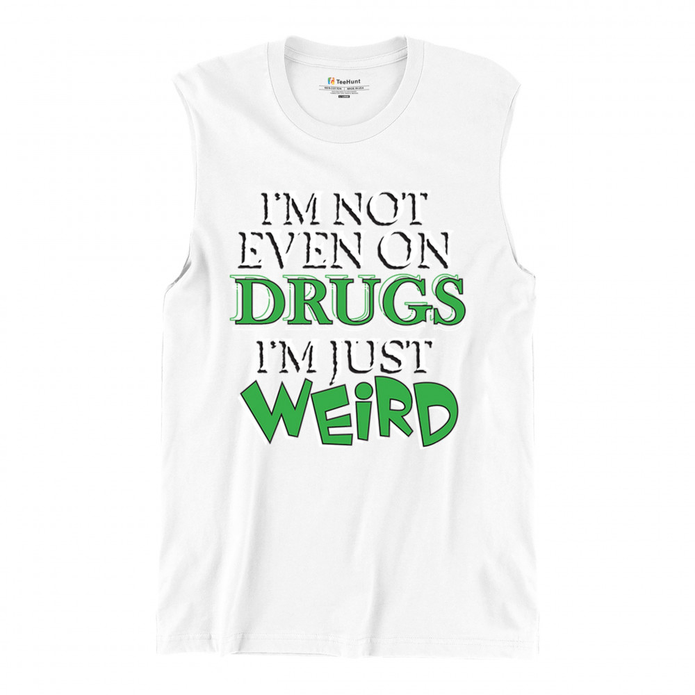 Bold weird design for introverts and quirky minds. Says “I'm not even on drugs I'm just weirdâ€â€”perfect for awkward humor and loud energy.