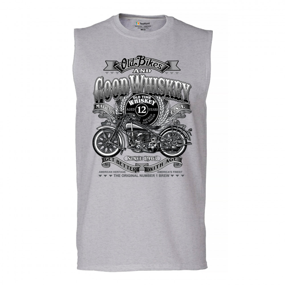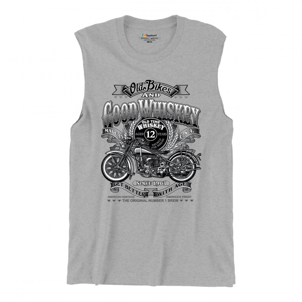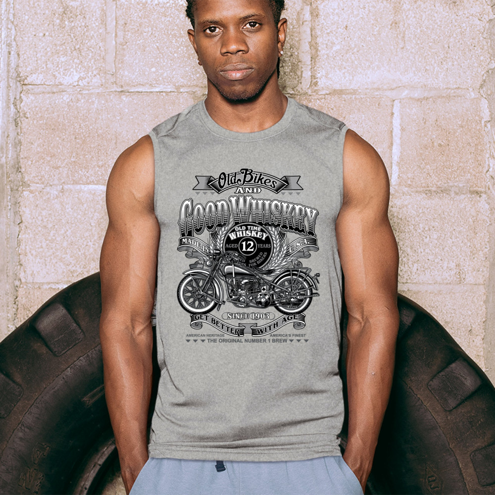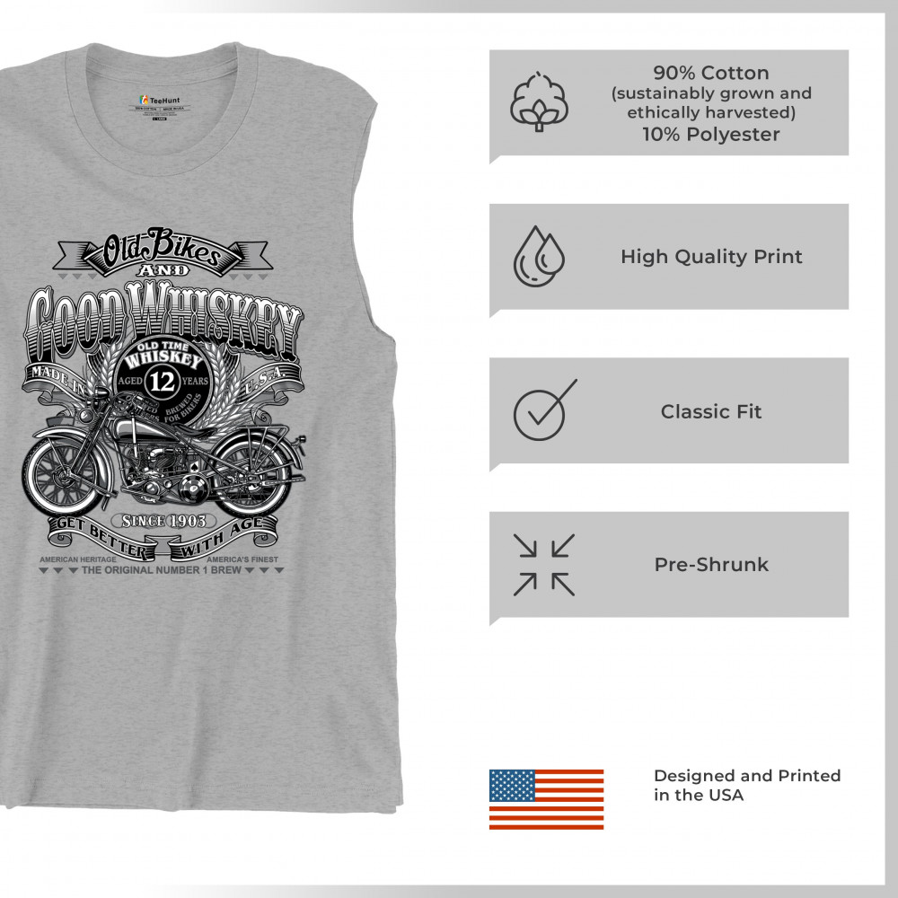 Vintage design with old bike, 12-year whiskey label, and 1903 tribute—perfect for bikers who ride hard and sip slow.