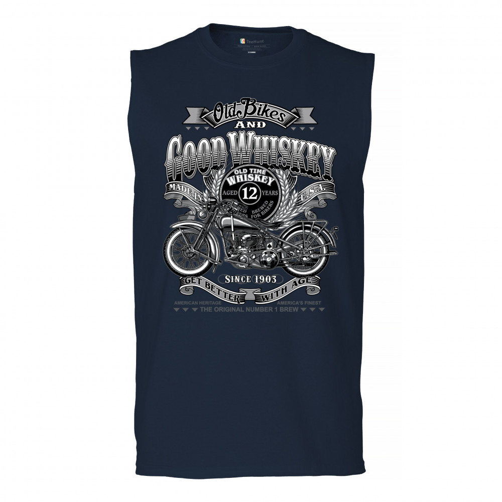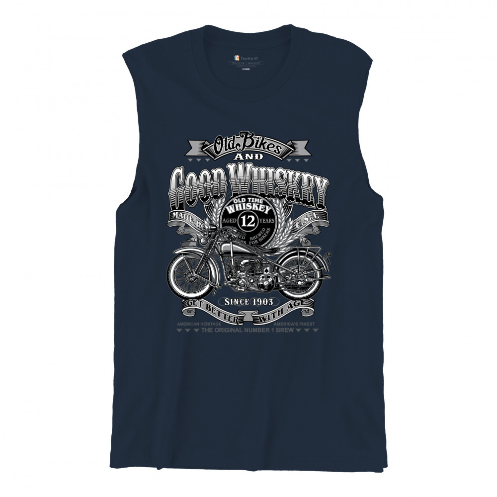 Vintage design with old bike, 12-year whiskey label, and 1903 tribute—perfect for bikers who ride hard and sip slow.