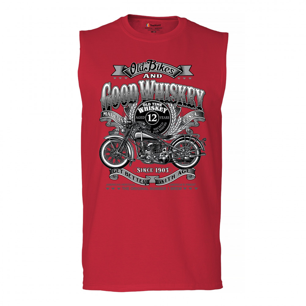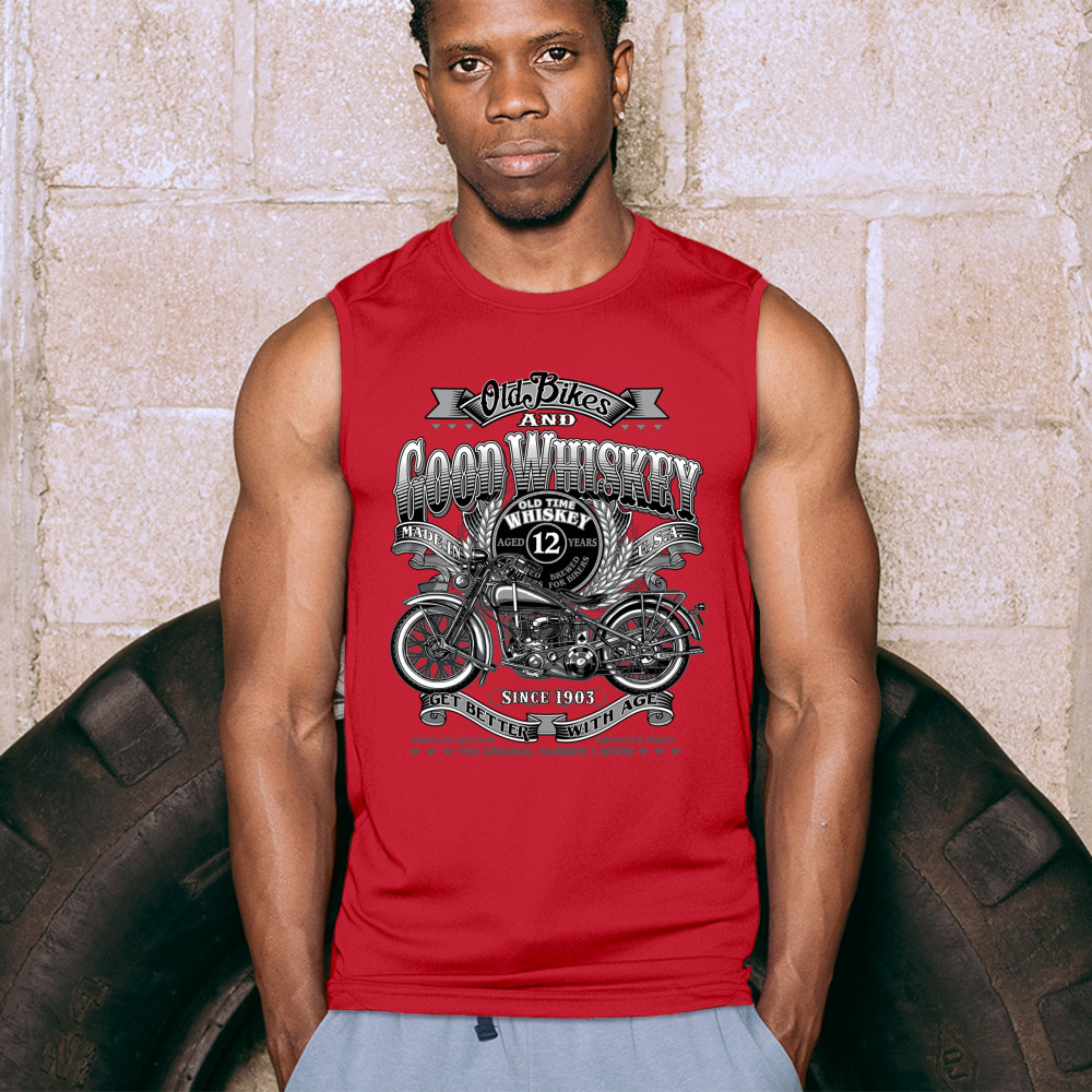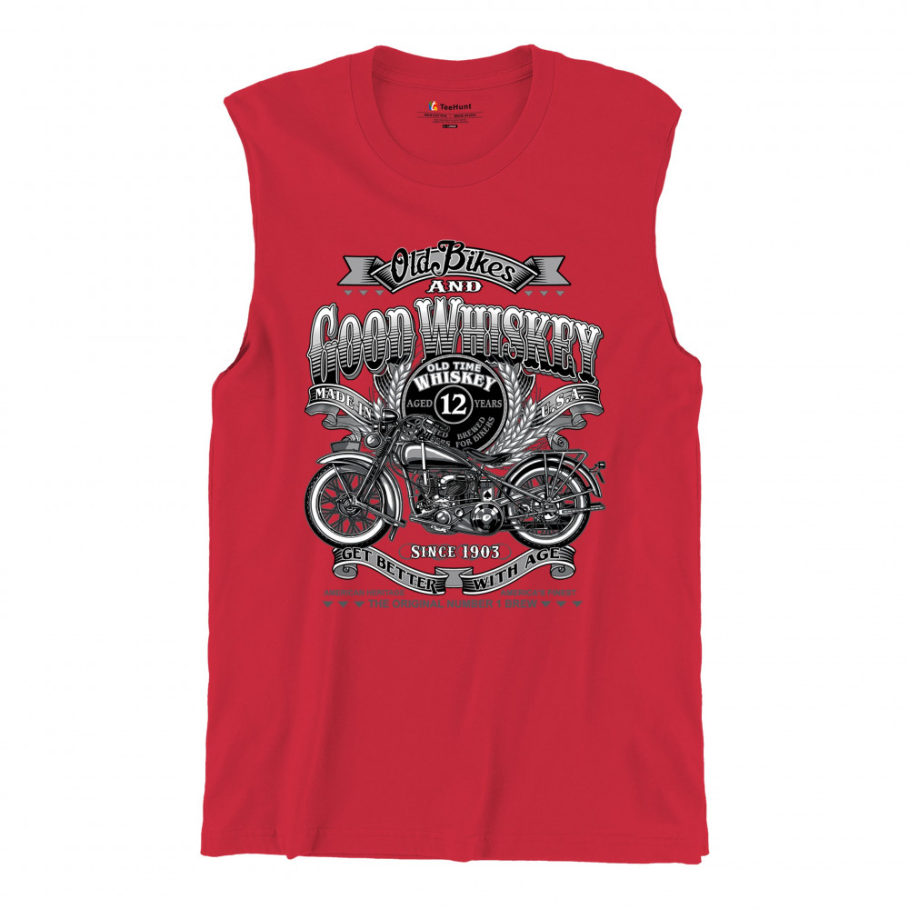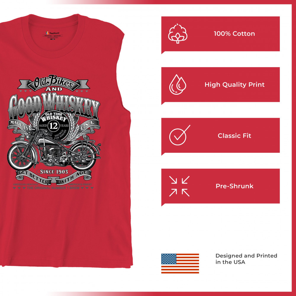 Vintage design with old bike, 12-year whiskey label, and 1903 tribute—perfect for bikers who ride hard and sip slow.