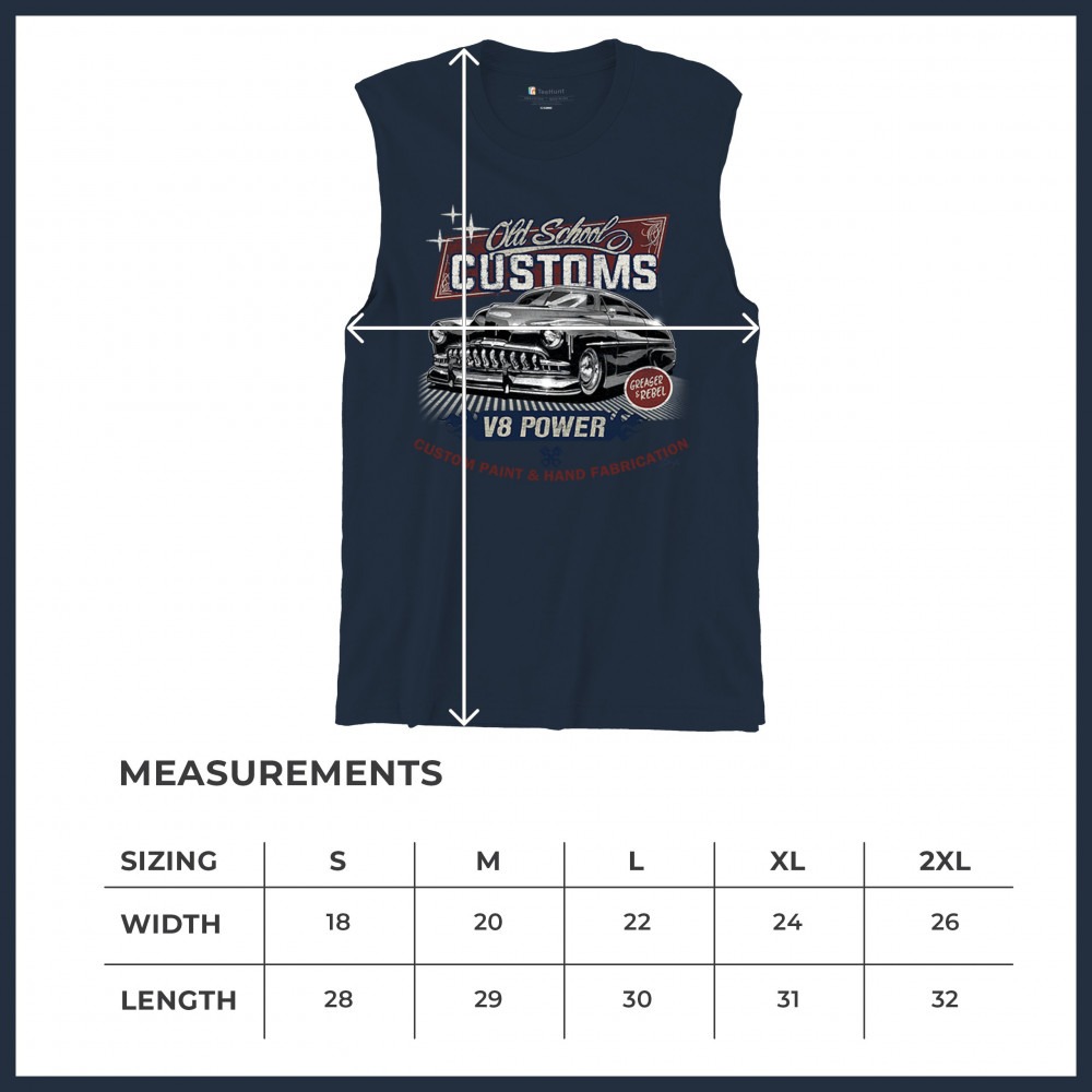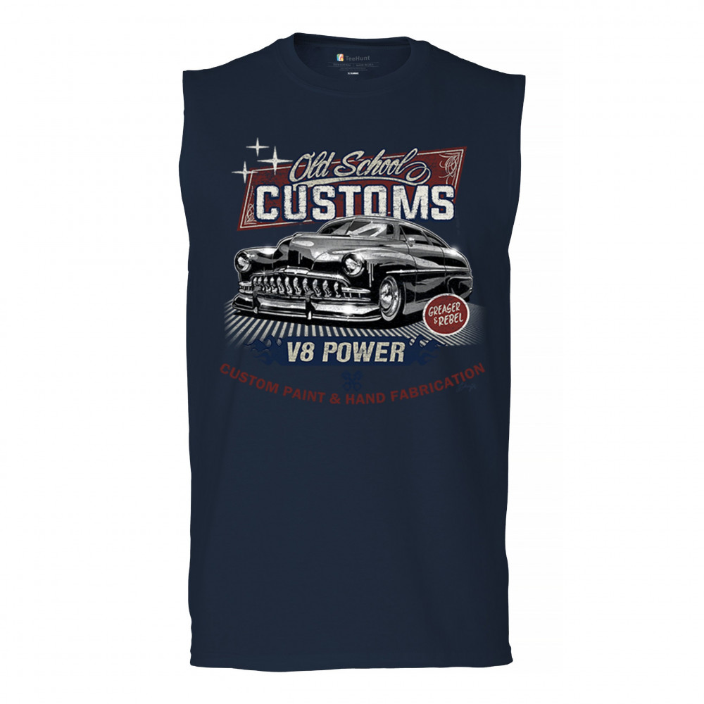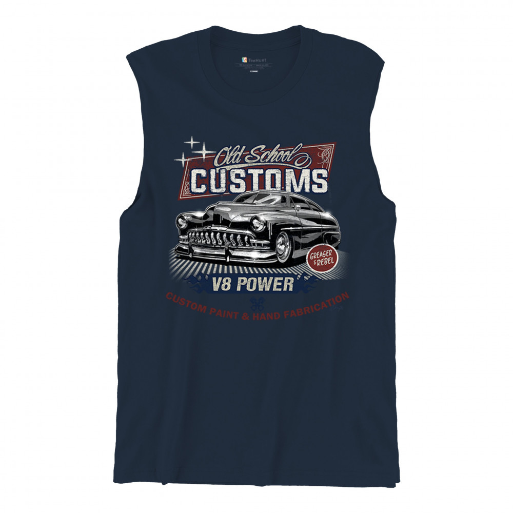 Celebrate classic automotive culture with our "Old School Customs" t-shirt, featuring a V8 power design. Perfect for car enthusiasts and fans of vintage rides.