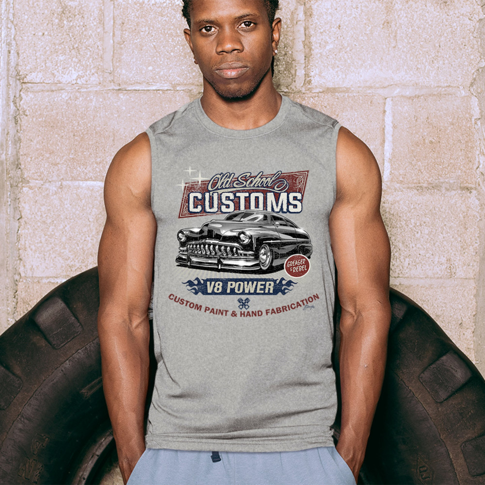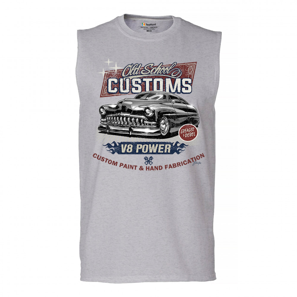 Celebrate classic automotive culture with our "Old School Customs" t-shirt, featuring a V8 power design. Perfect for car enthusiasts and fans of vintage rides.