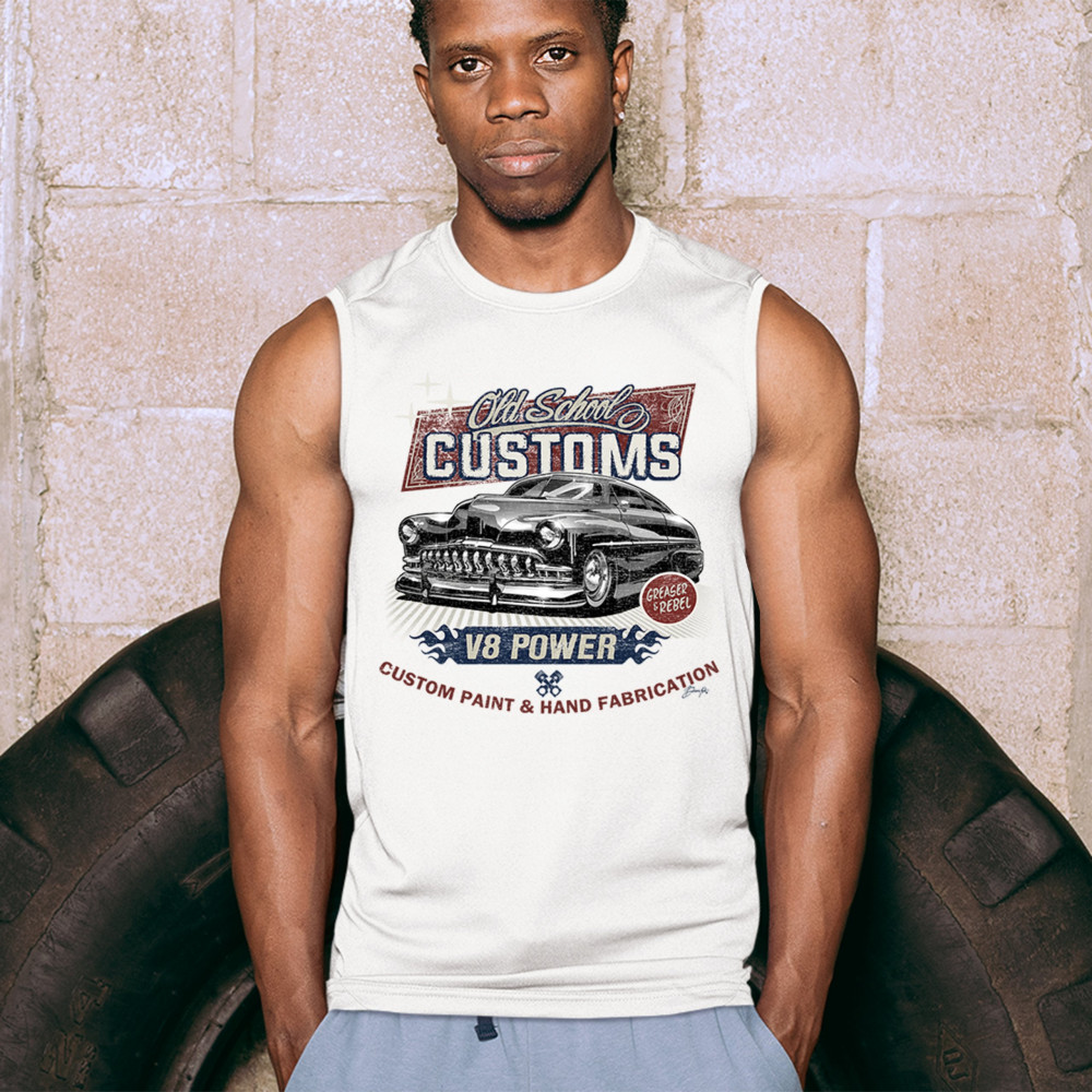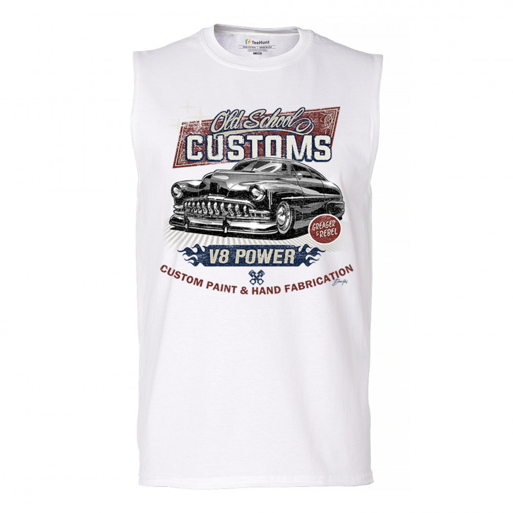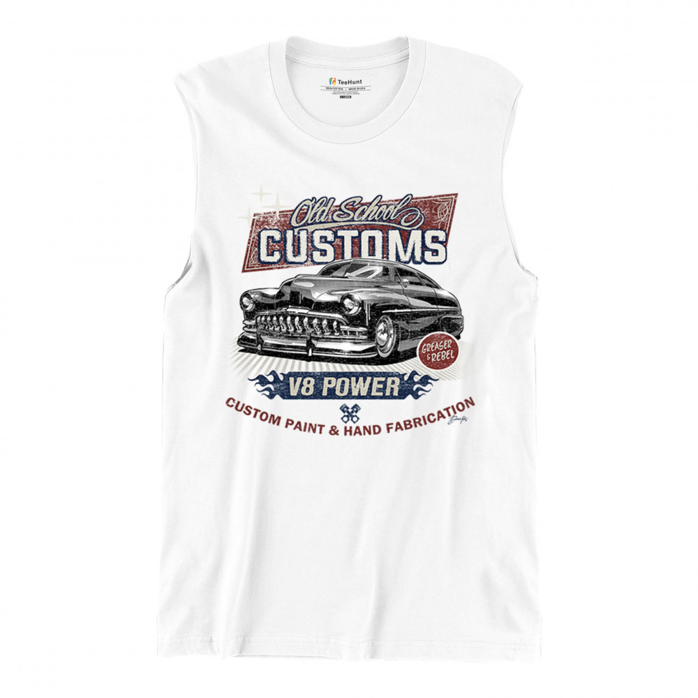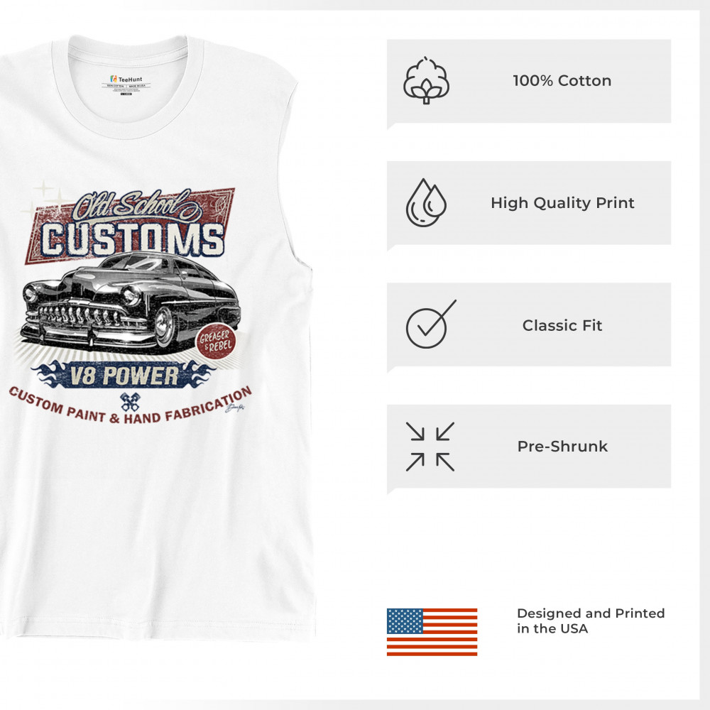 Celebrate classic automotive culture with our "Old School Customs" t-shirt, featuring a V8 power design. Perfect for car enthusiasts and fans of vintage rides.