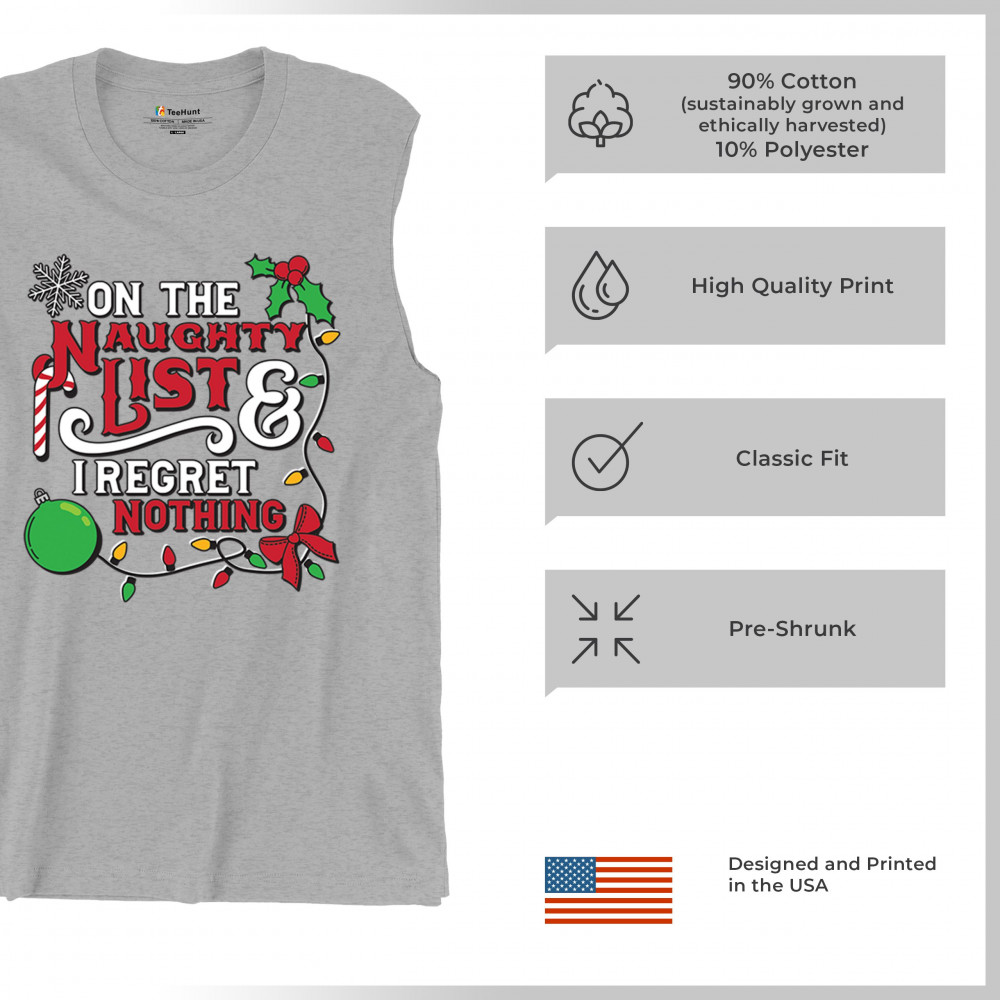 Express your holiday spirit with humor through the "Naughty List & I Regret Nothing" design, a perfect companion for Christmas celebrations, gift exchanges, or festive family gatherings. It adds a touch of playfulness to your winter wardrobe while spreading joy and laughter. Ideal for pairing with an ugly sweater or cozy holiday apparel, it’s the ultimate way to stay jolly and carefree throughout the season.