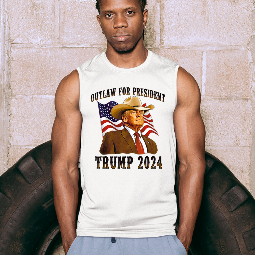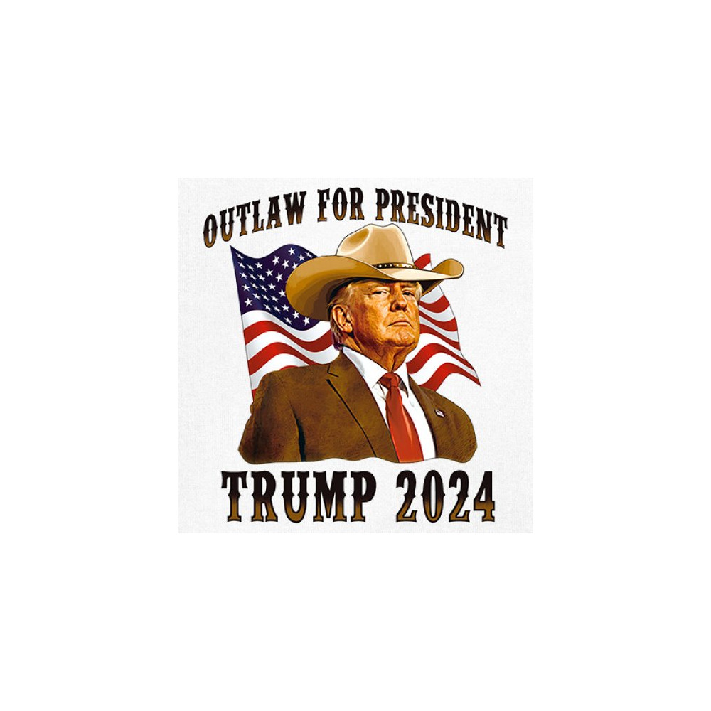 The "Outlaw for President" Trump 2024 design is a powerful symbol of American resilience and conservative pride. Featuring Donald J. Trump in a cowboy hat with the American flag waving behind, this design speaks to supporters who believe in the America First movement, conservative values, and a rebel spirit. Ideal for rallies, patriotic events, and anyone looking to make a bold statement for the 47th President of the United States.