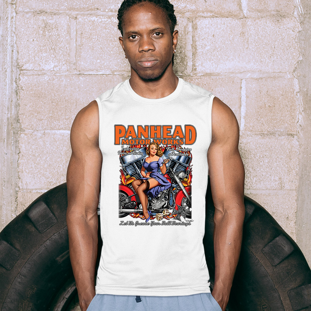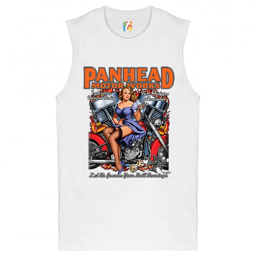 A print featuring a sexy pin-up girl sitting on a chopper motorcycle holding a wrench. In the background there is a V-engine. The print says: "Panhead motor works, Lubrication boring and stroking, Full service available, Let us grease your ball bearings".