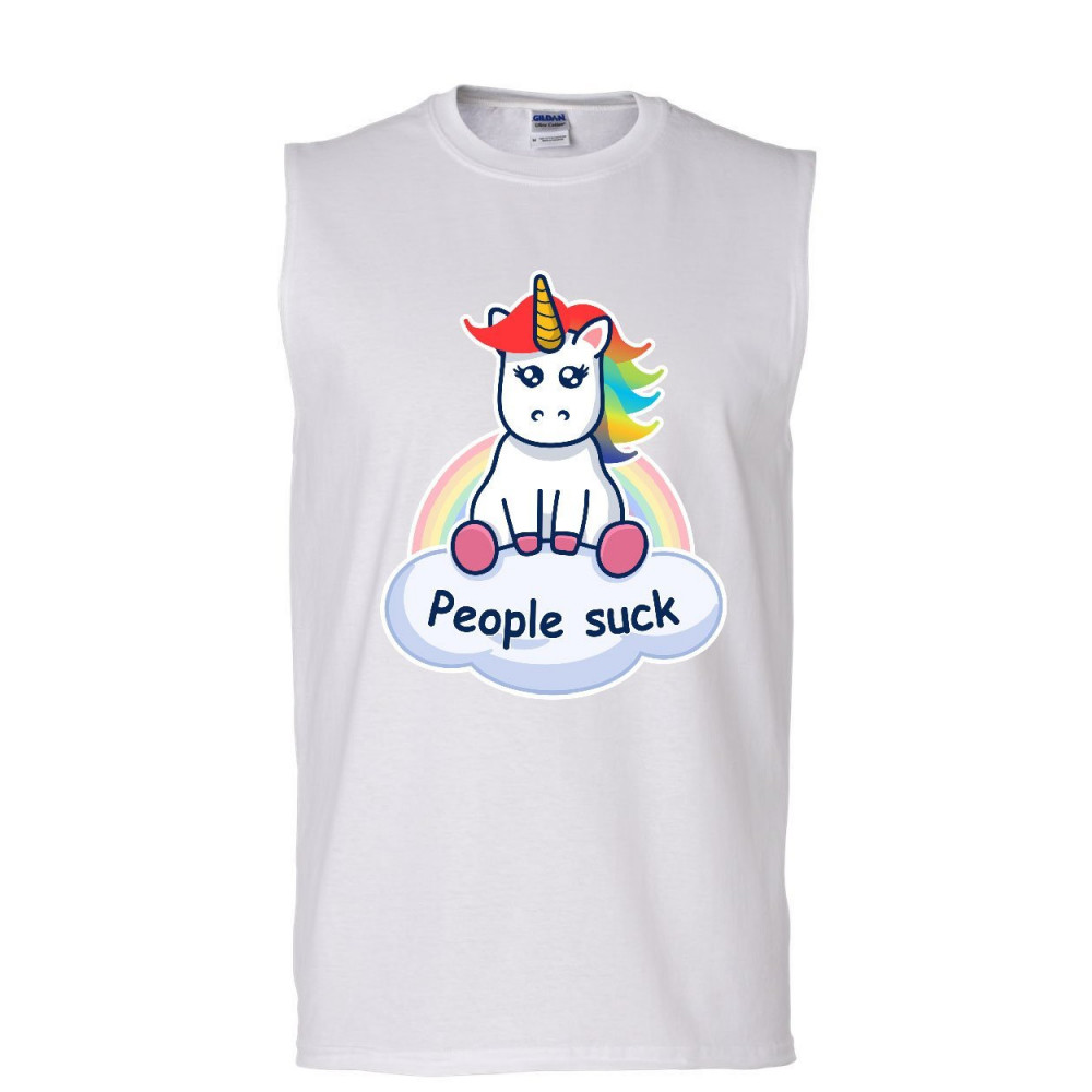 PEOPLE SUCK cute unicorn muscle shirt funny rainbow pony introvert sleeveless white