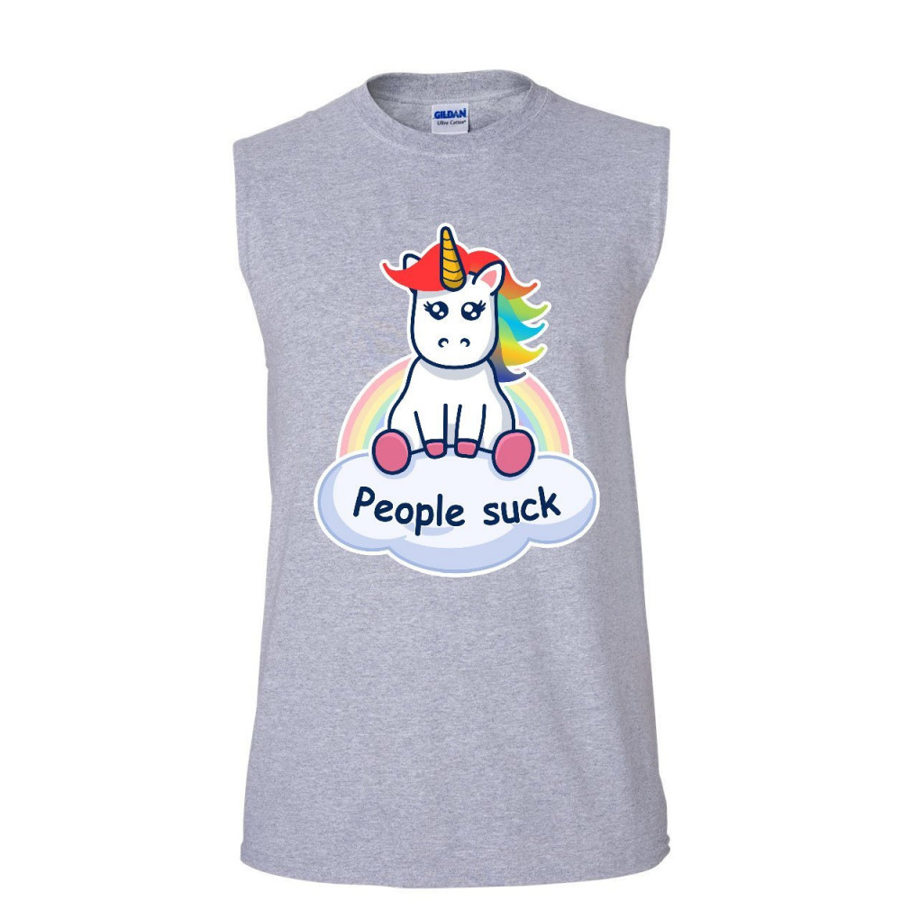 PEOPLE SUCK cute unicorn muscle shirt funny rainbow pony introvert sleeveless gray