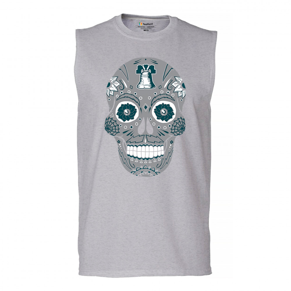 Philly sugar skull with liberty bell art, marigold flower calavera, gothic Philly art, sports culture pride, and game day skull vibes.