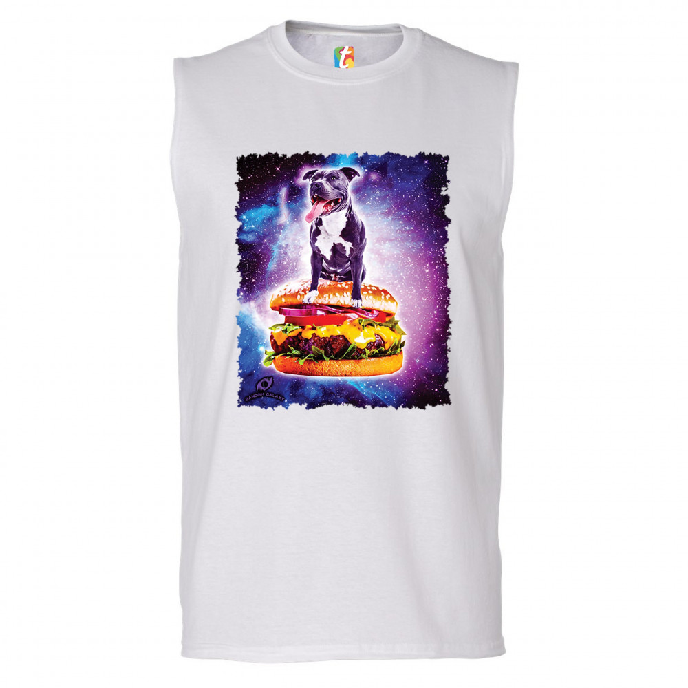 PIT BULL RIDING A BURGER FLYING THROUGH GALAXY muscle shirt funny pet men's white