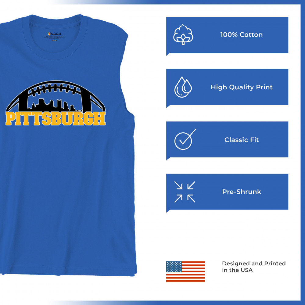 Embrace your Steel City pride with this bold Pittsburgh-themed design, showcasing the city skyline in a unique football graphic. Perfect for game day celebrations, tailgating parties, or everyday wear, this design captures the energy and passion of Pittsburgh's legendary sports culture. Whether you're cheering on your favorite team or representing your city, this design is a must-have for Pittsburgh fans.
