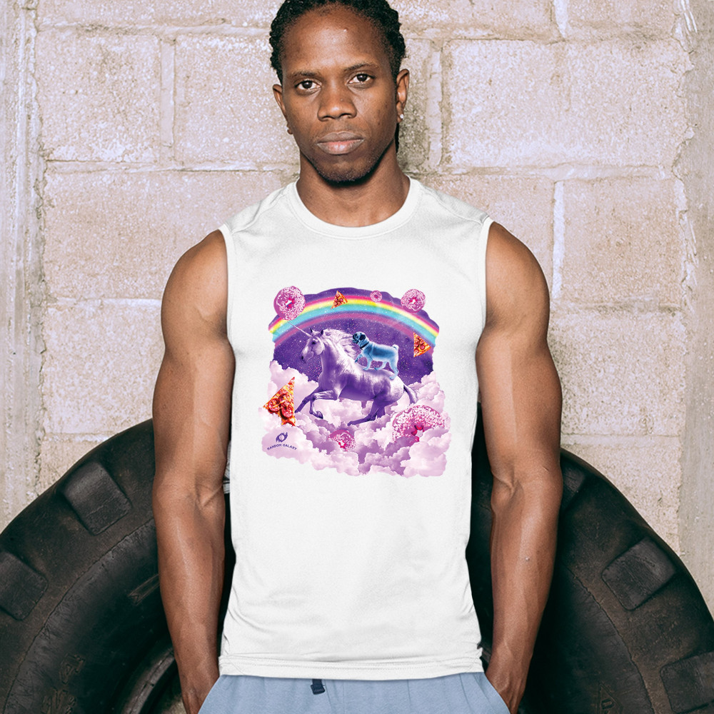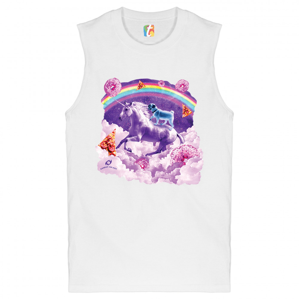 A beautiful print featuring a pug standing on a back of a unicorn galloping through clouds. In the background a rainbow crossing the space is seen. Across the clouds numerous pizza slices and donuts are scattered. A great choice for a person who loves pug