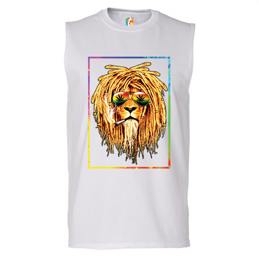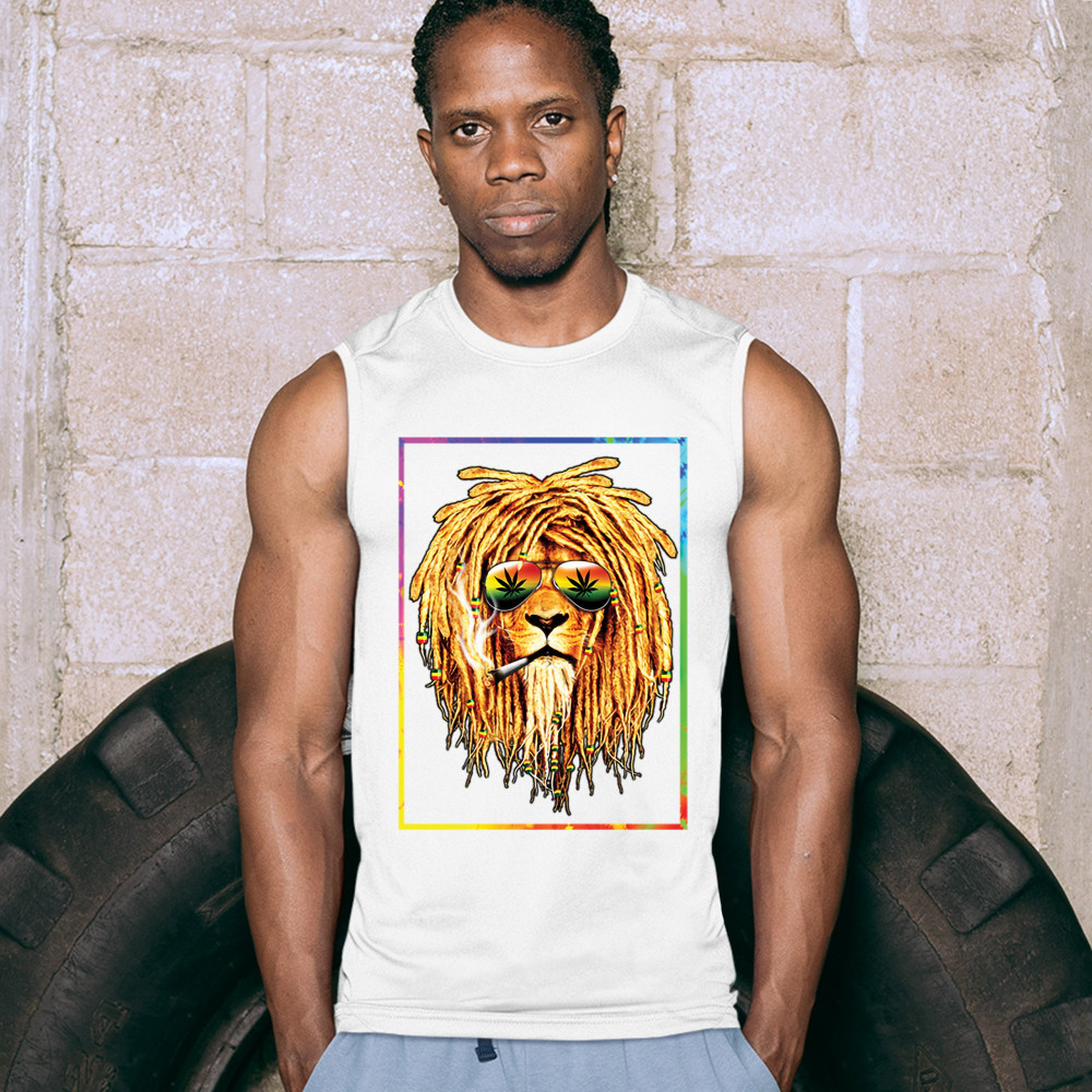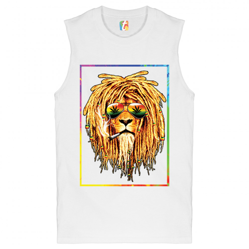 A print featuring a lion with dreadlocks smoking a joint and wearing sunglasses with marijuana leaves reflected in the them. The beads on the lion's dreadlocks and the glasses are painted with traditional Jamaican colors. Great choice for a pot aficionado