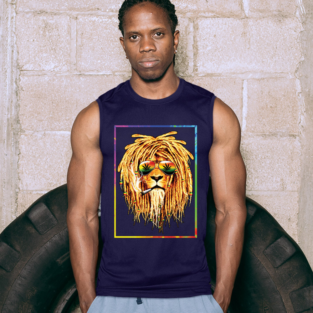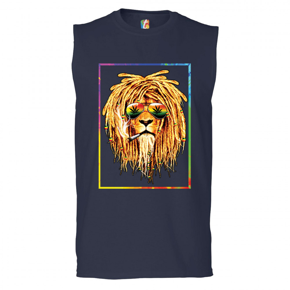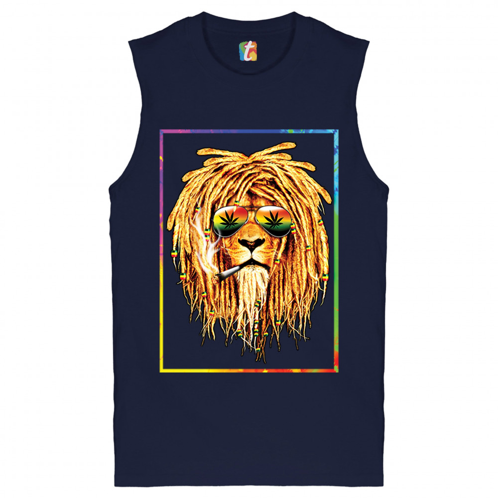 RASTA LION WEARING SUNGLASSES muscle shirt 420 pot cannabis smoking jah men's navy blue