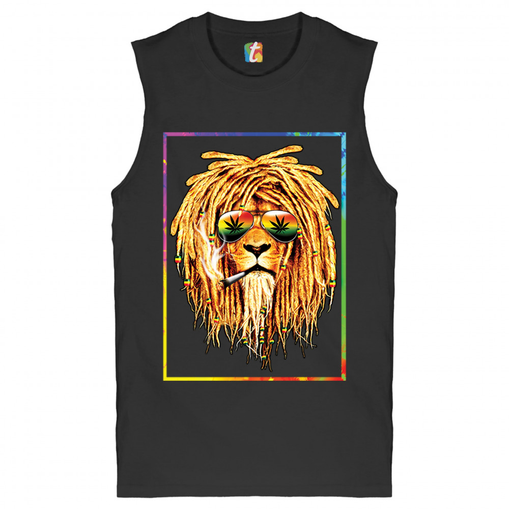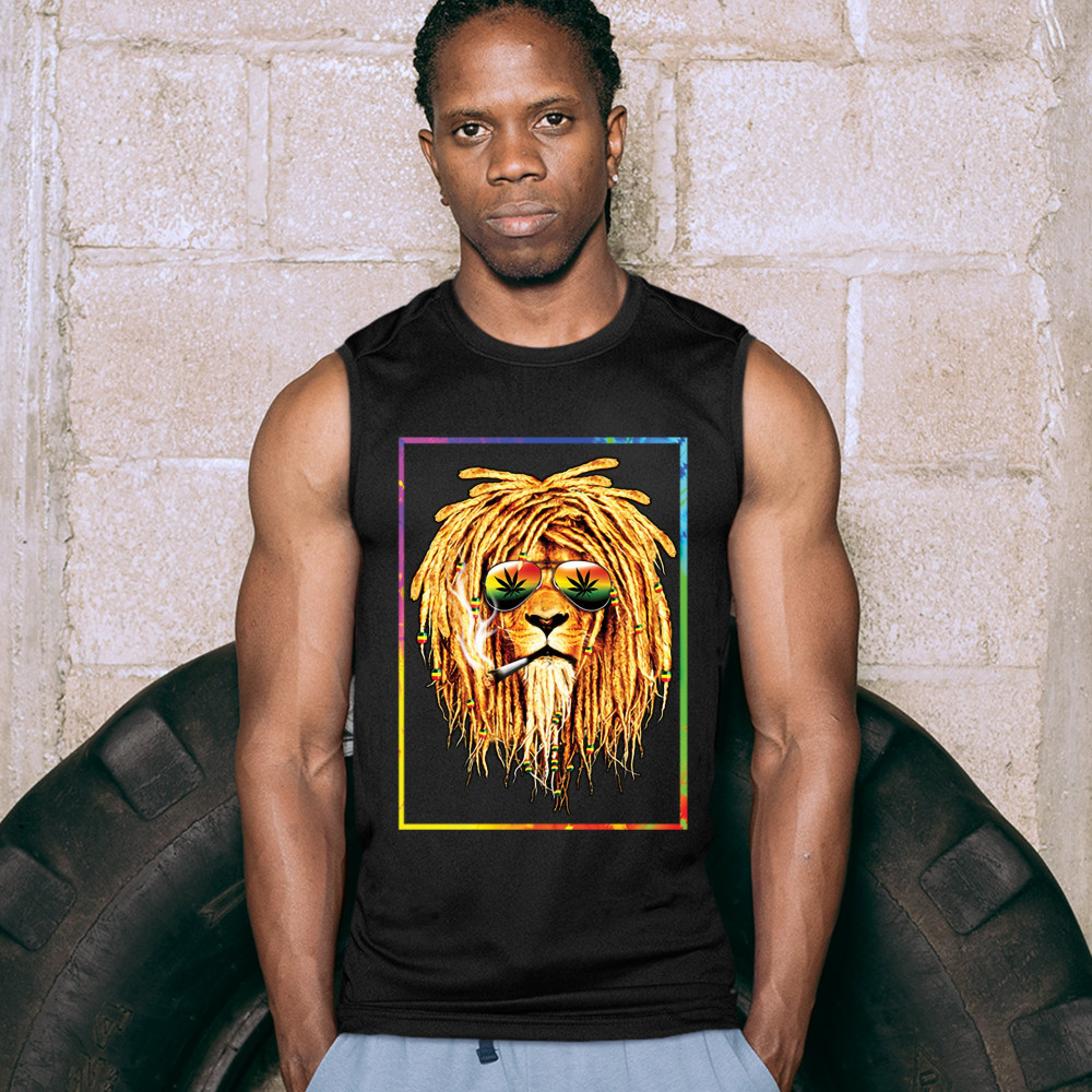 A print featuring a lion with dreadlocks smoking a joint and wearing sunglasses with marijuana leaves reflected in the them. The beads on the lion's dreadlocks and the glasses are painted with traditional Jamaican colors. Great choice for a pot aficionado