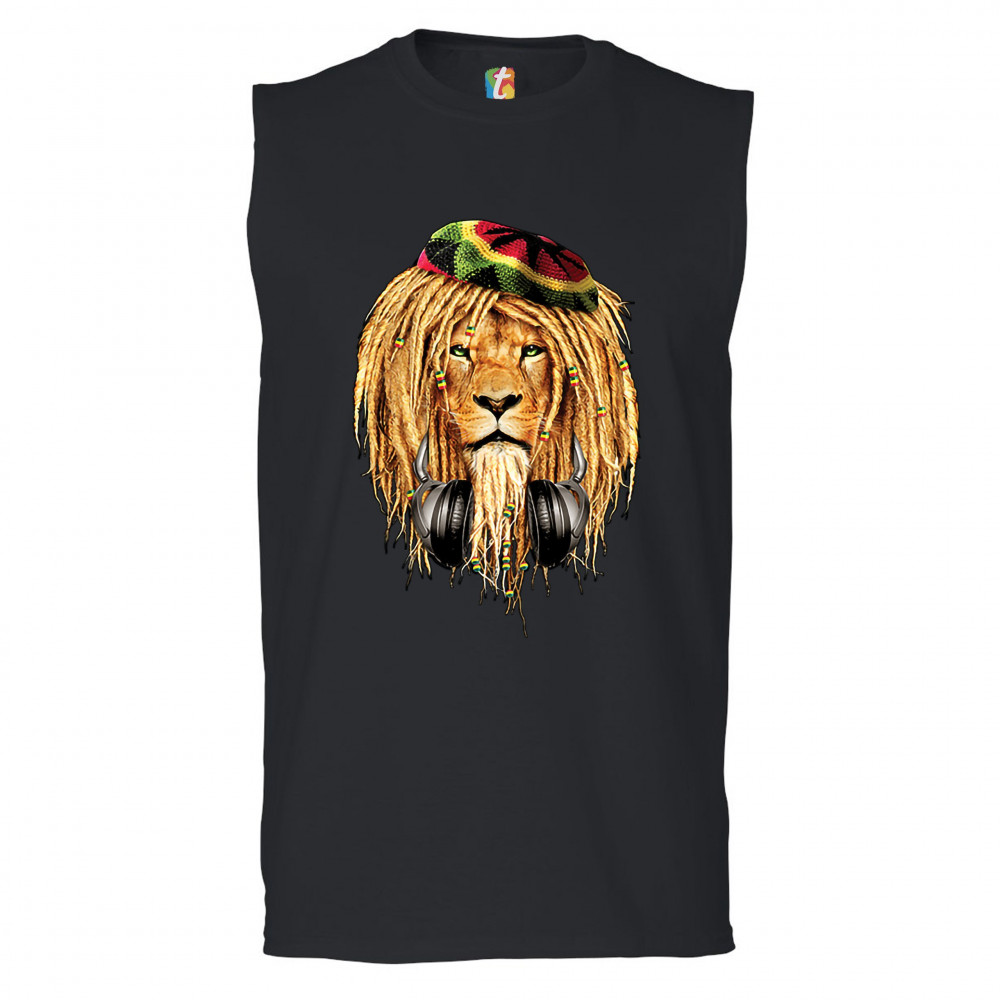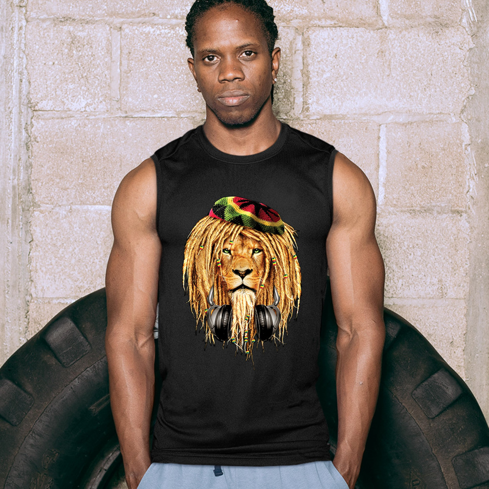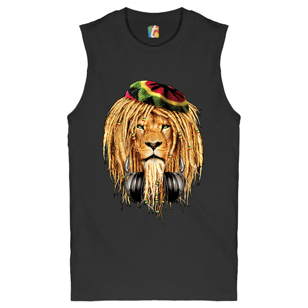 RASTA LION WITH HEADPHONES muscle shirt jah jamaica reggae 420 culture men's black