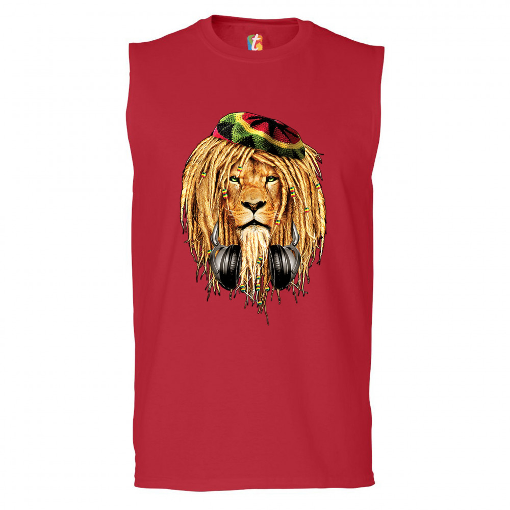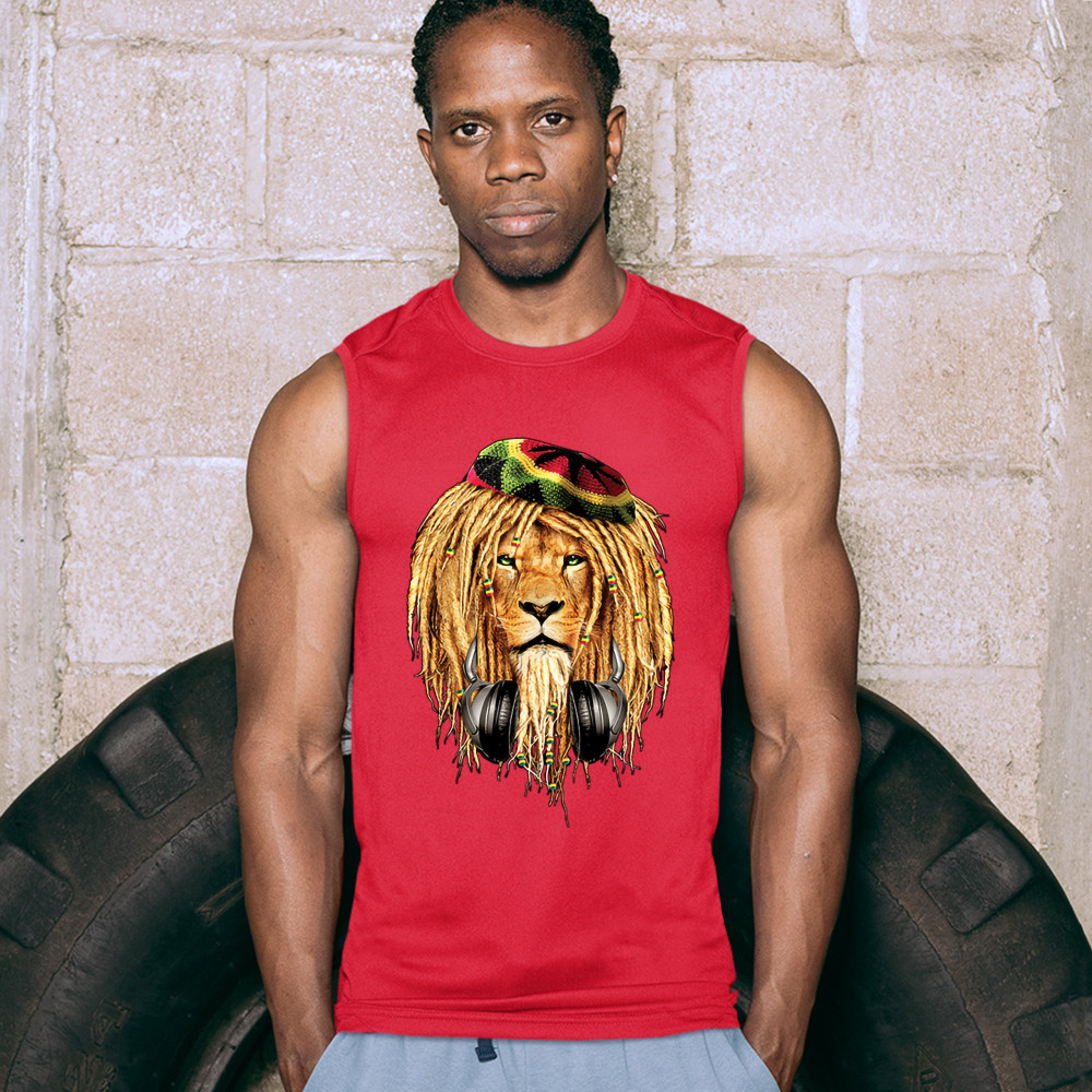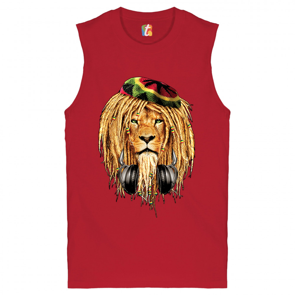 RASTA LION WITH HEADPHONES muscle shirt jah jamaica reggae 420 culture men's red