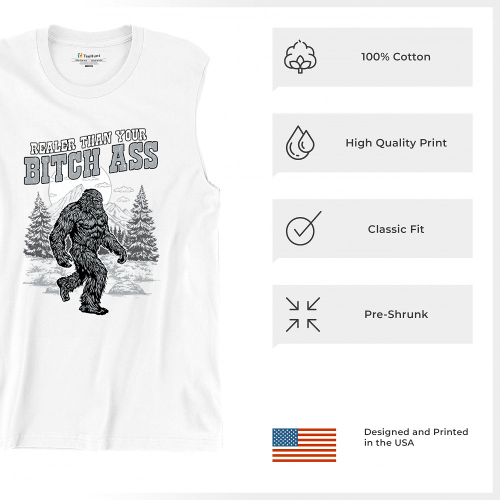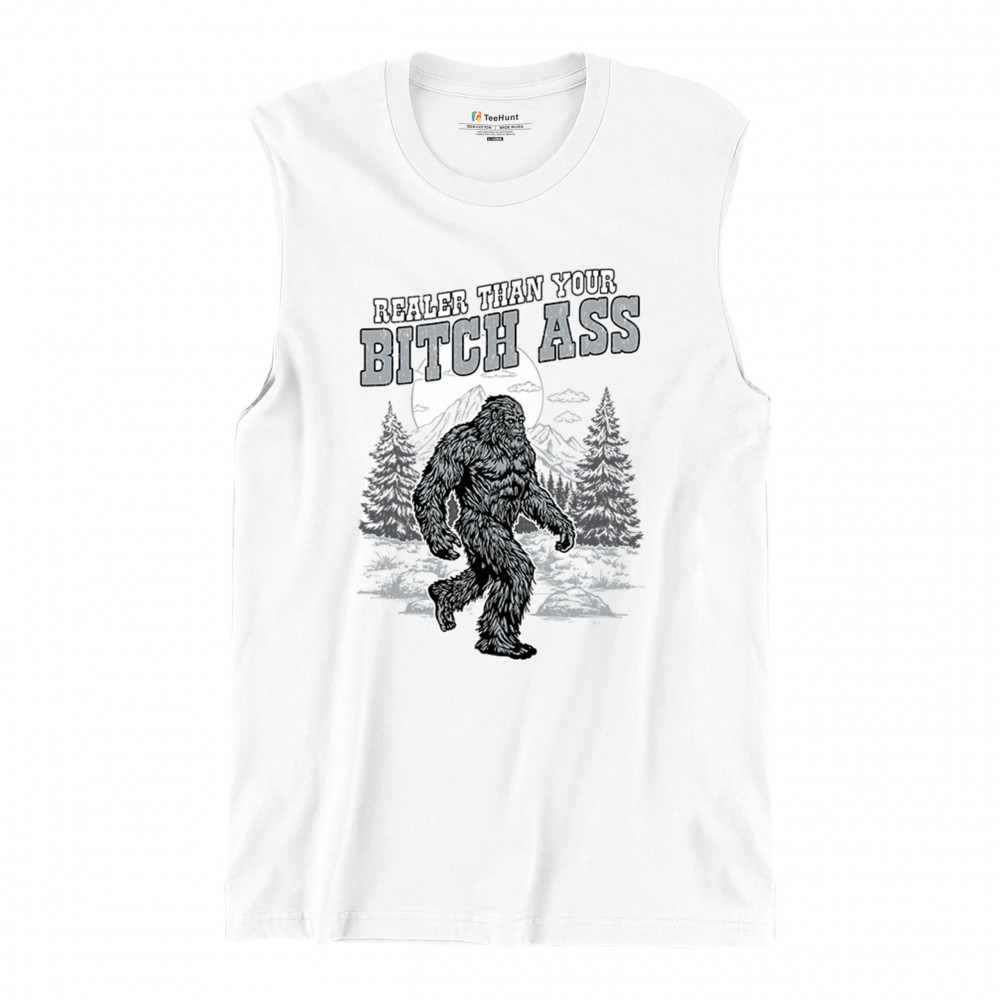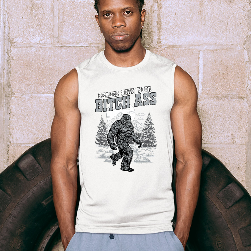 Edgy Bigfoot design with sarcastic cryptid humor and gritty wilderness style. Great for trolls, jokers, and rugged outdoors fans.