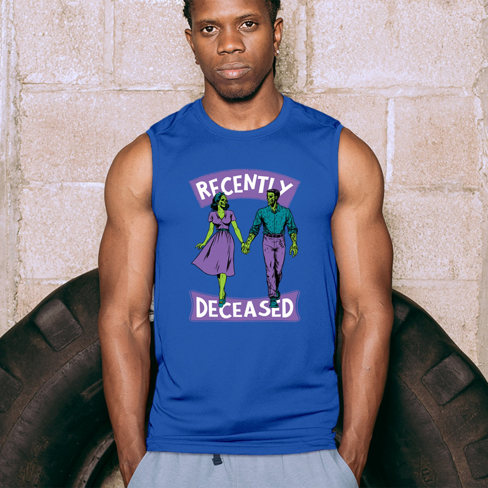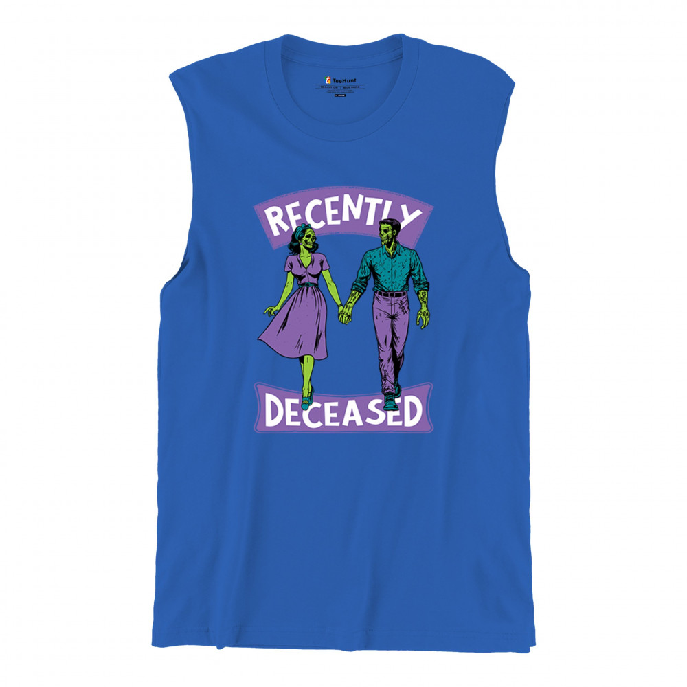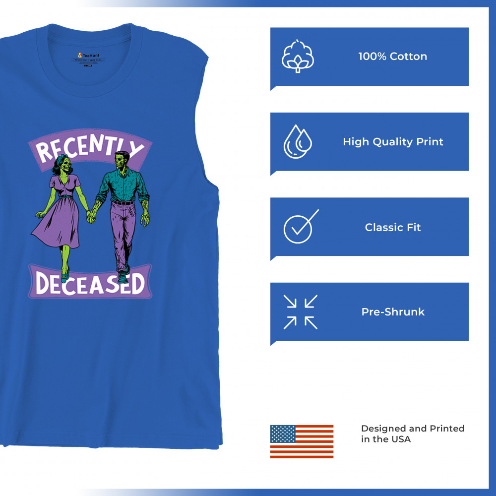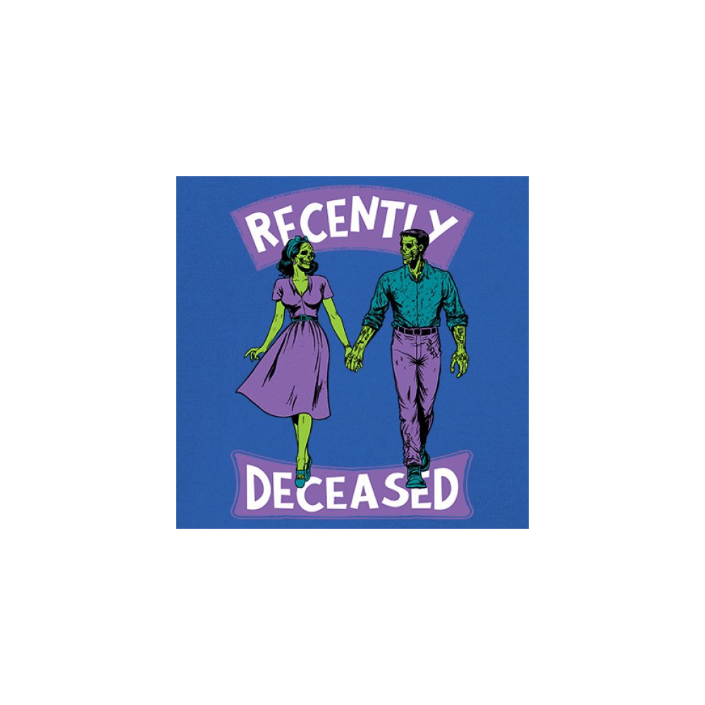 Recently Deceased zombie couple shirt with undead lovers design, spooky season humor, Halloween zombie outfit, and haunted house vibes.