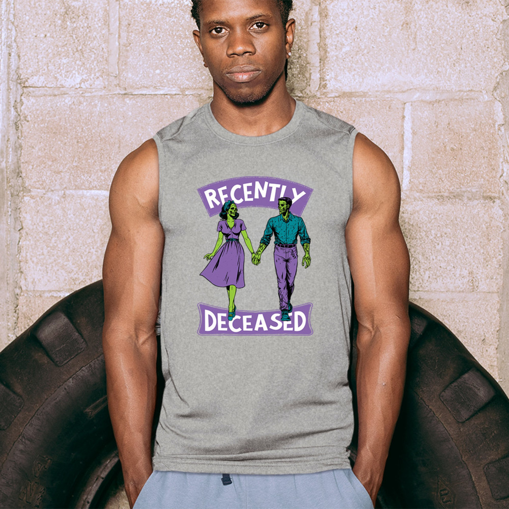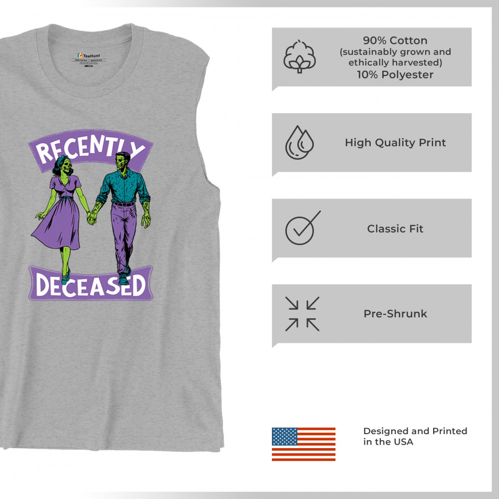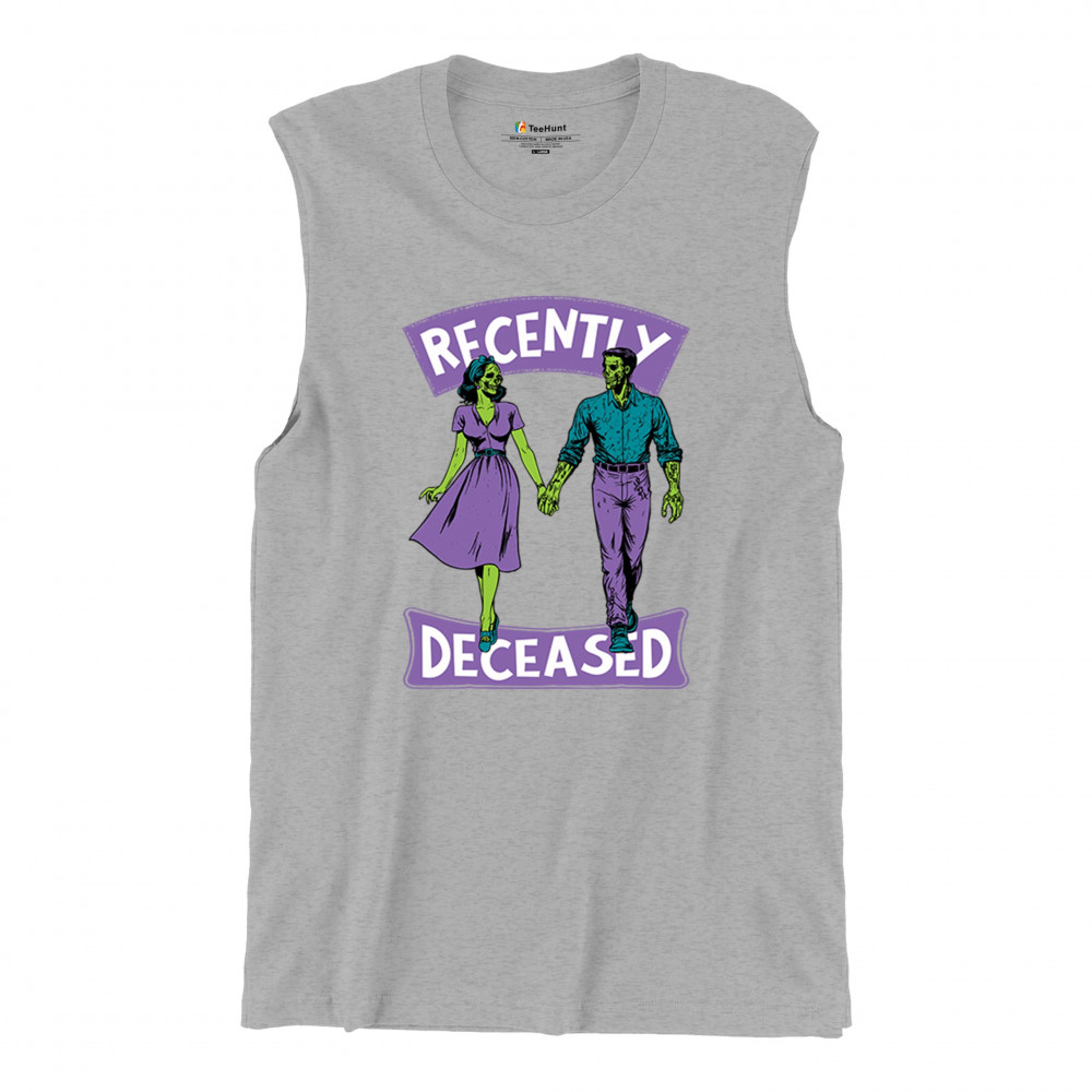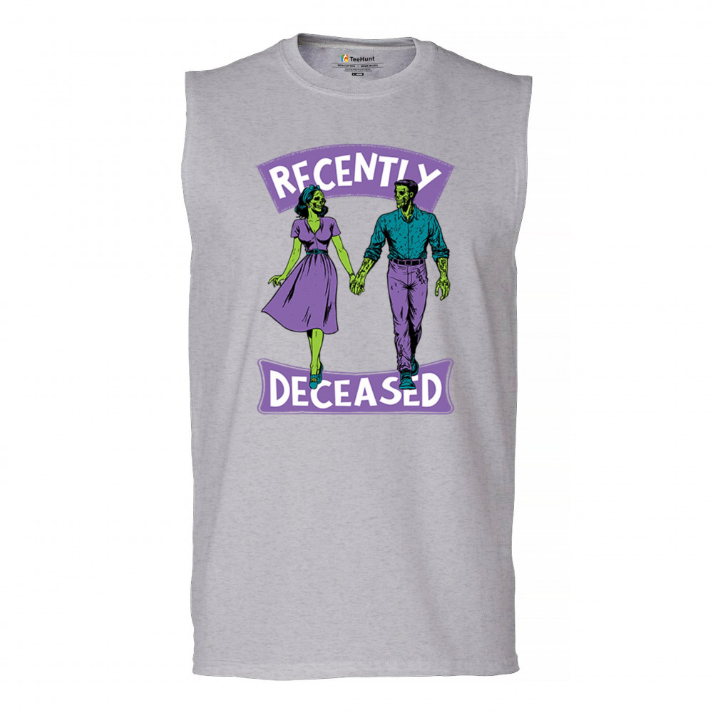 Recently Deceased zombie couple shirt with undead lovers design, spooky season humor, Halloween zombie outfit, and haunted house vibes.
