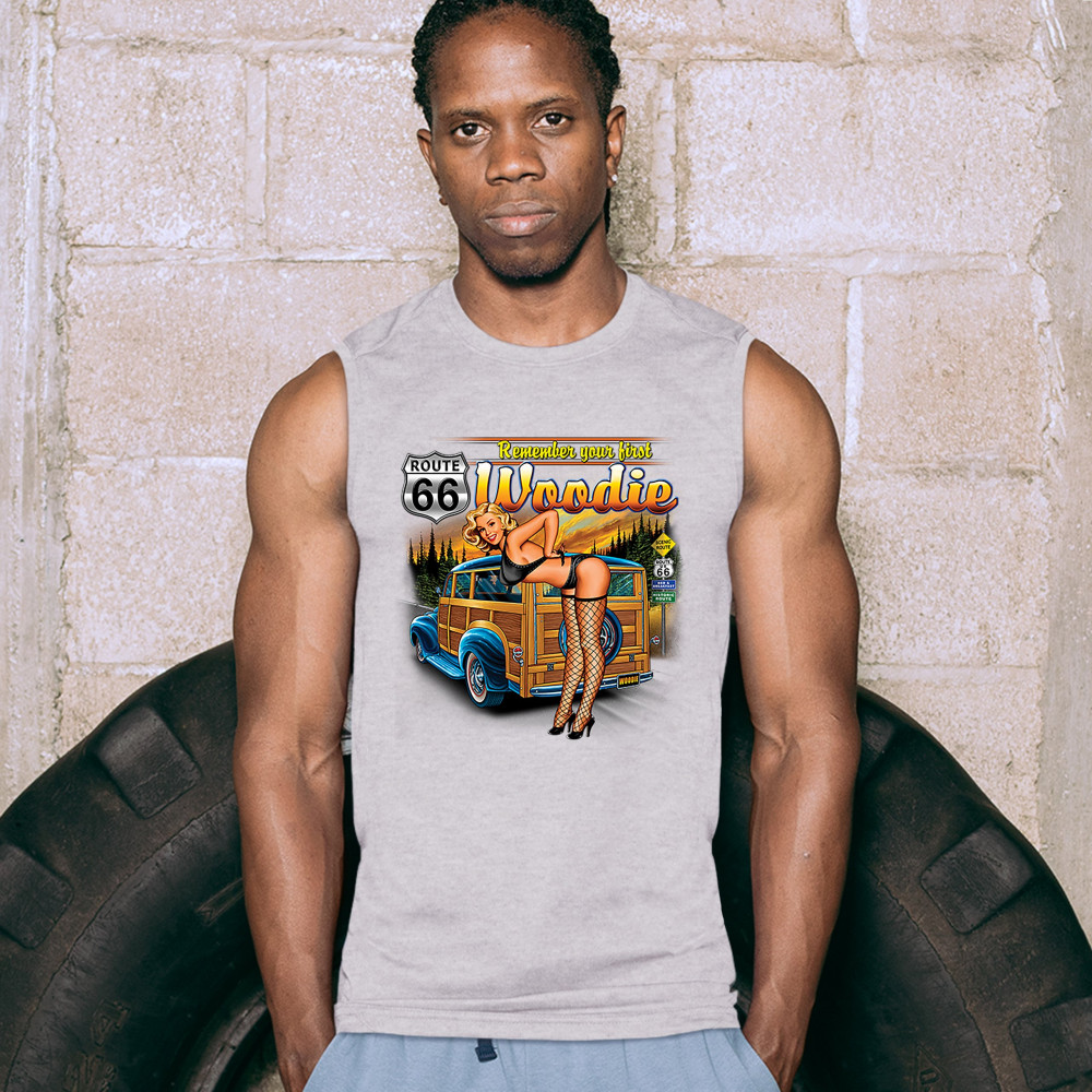 A print featuring a sexy blonde pin-up girl bending over and taking off her bra. Behind her there is a woodie wagon driving on a road. The print says: "Remeber your first woodie" and features a Route 66. A great choice for a fan of the legendary Mother Ro