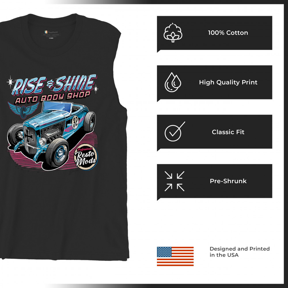 Celebrate vintage car culture with our "Rise & Shine Auto Body Shop" design. Perfect for car enthusiasts and auto restoration fans. Comfortable and durable.