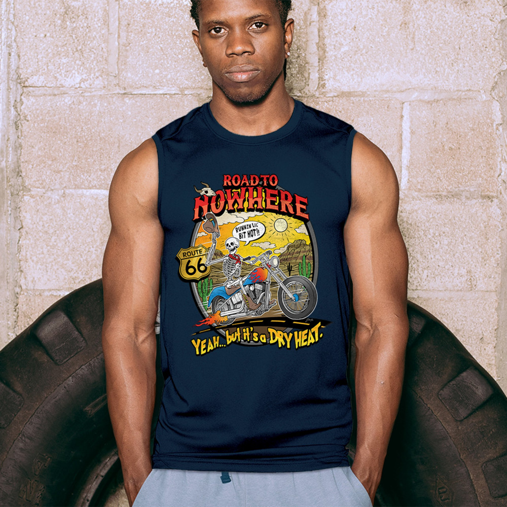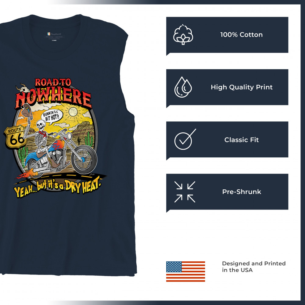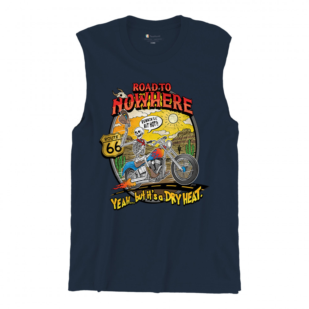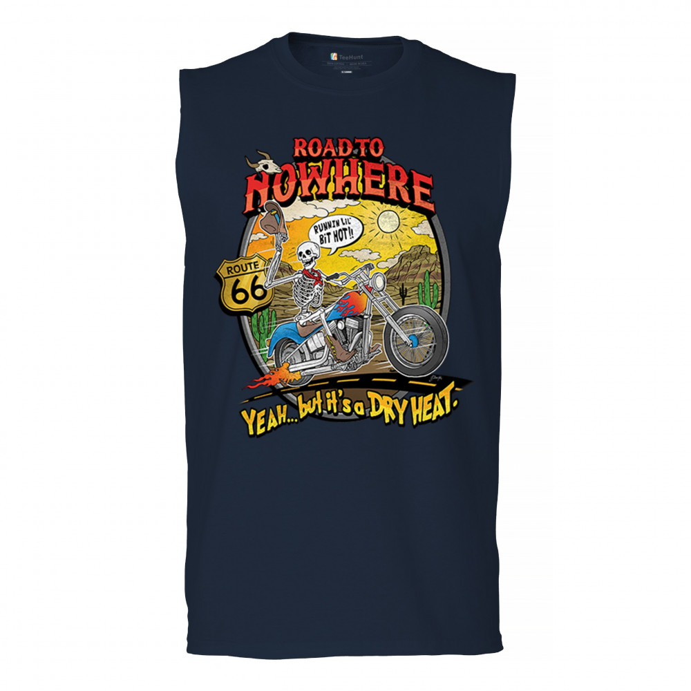 Discover the 'Road to Nowhere' T-shirt: a blend of bold graphics and adventurous spirit. Embrace the ride with our Route 66 skeleton biker design.