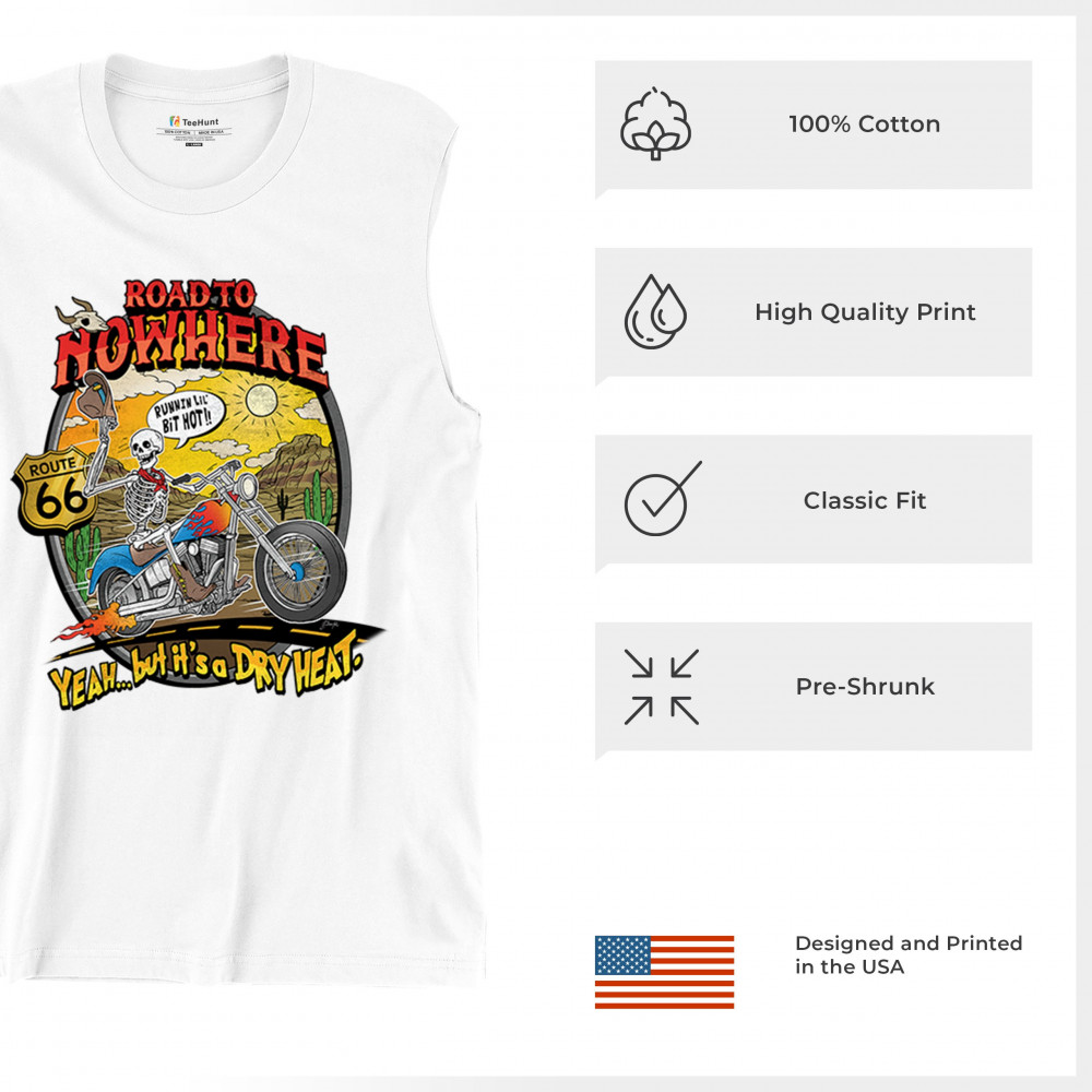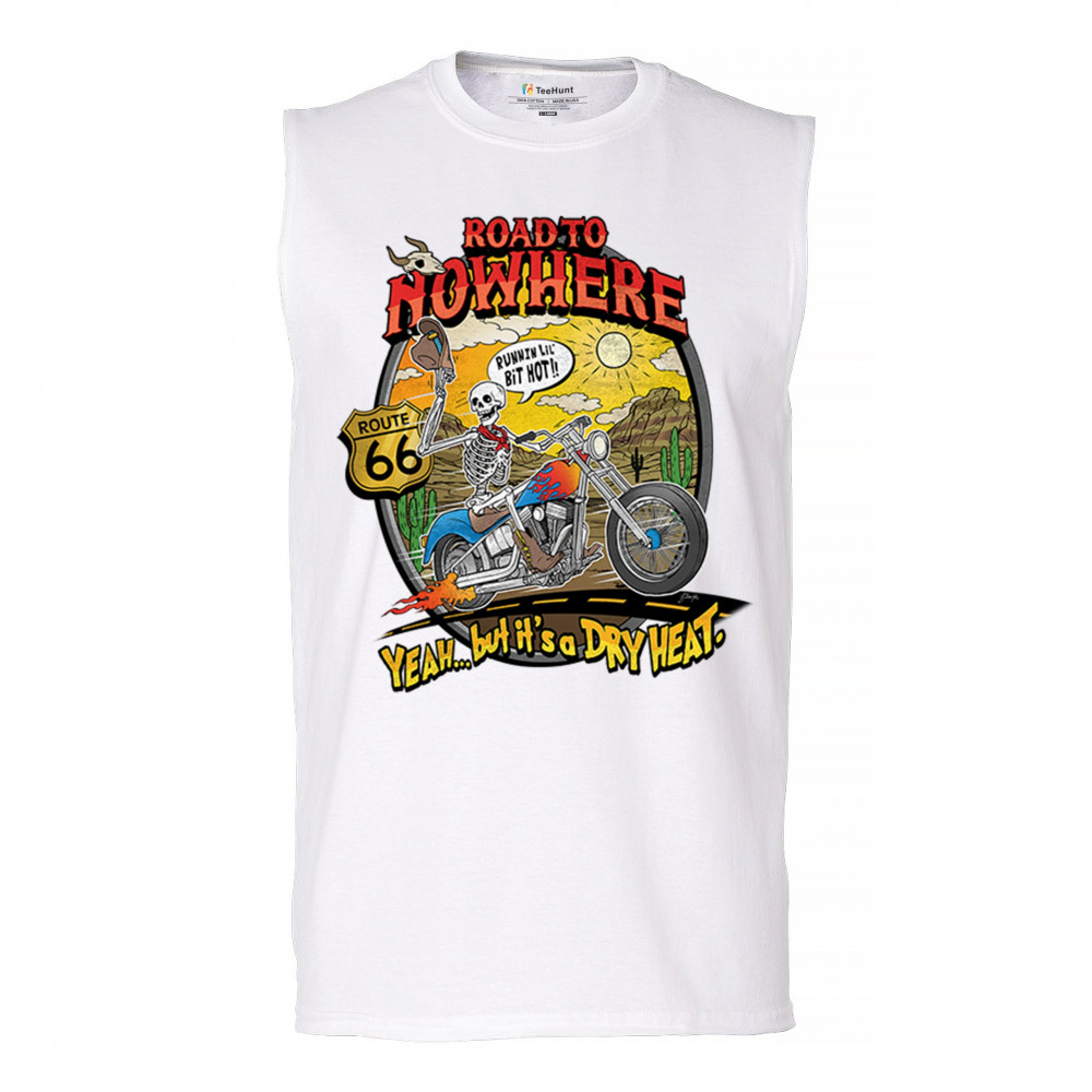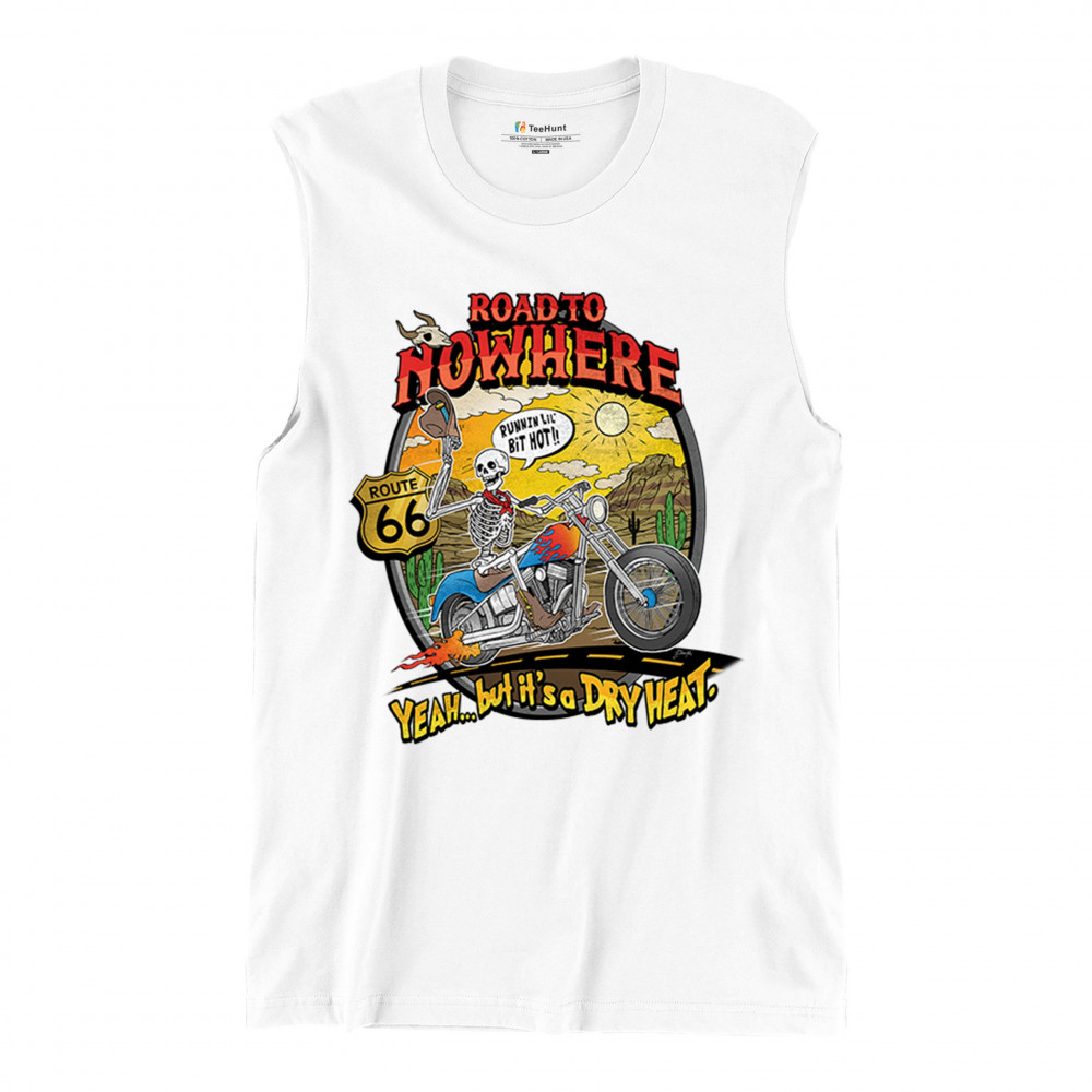 Discover the 'Road to Nowhere' T-shirt: a blend of bold graphics and adventurous spirit. Embrace the ride with our Route 66 skeleton biker design.