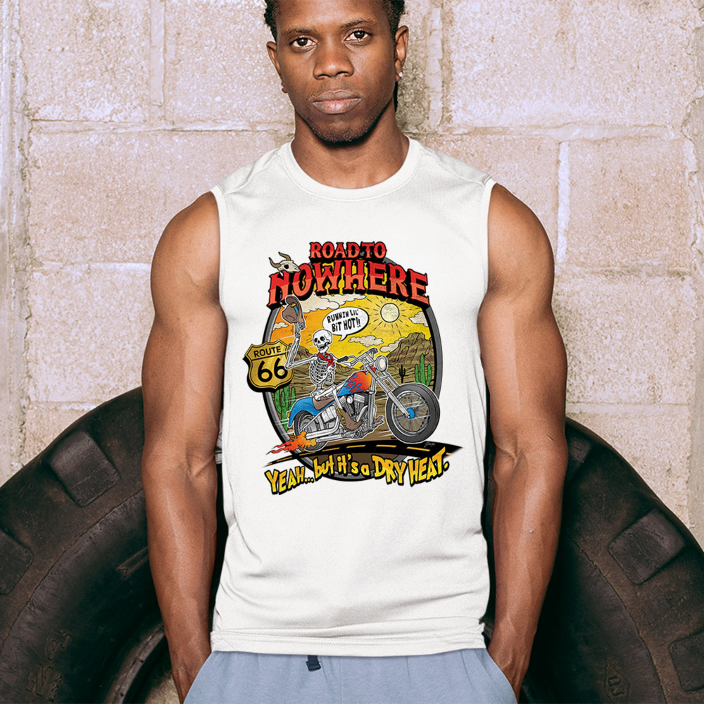 Our 'Road to Nowhere' tee is a salute to the thrill-seekers and the heat-bravers. Adorned with a bold skeleton cruising down Route 66, it embodies the spirit of adventure with a touch of playful defiance. A statement piece for anyone who lives for the ride and laughs in the face of danger. Join the ride into the sunset with this daring design.