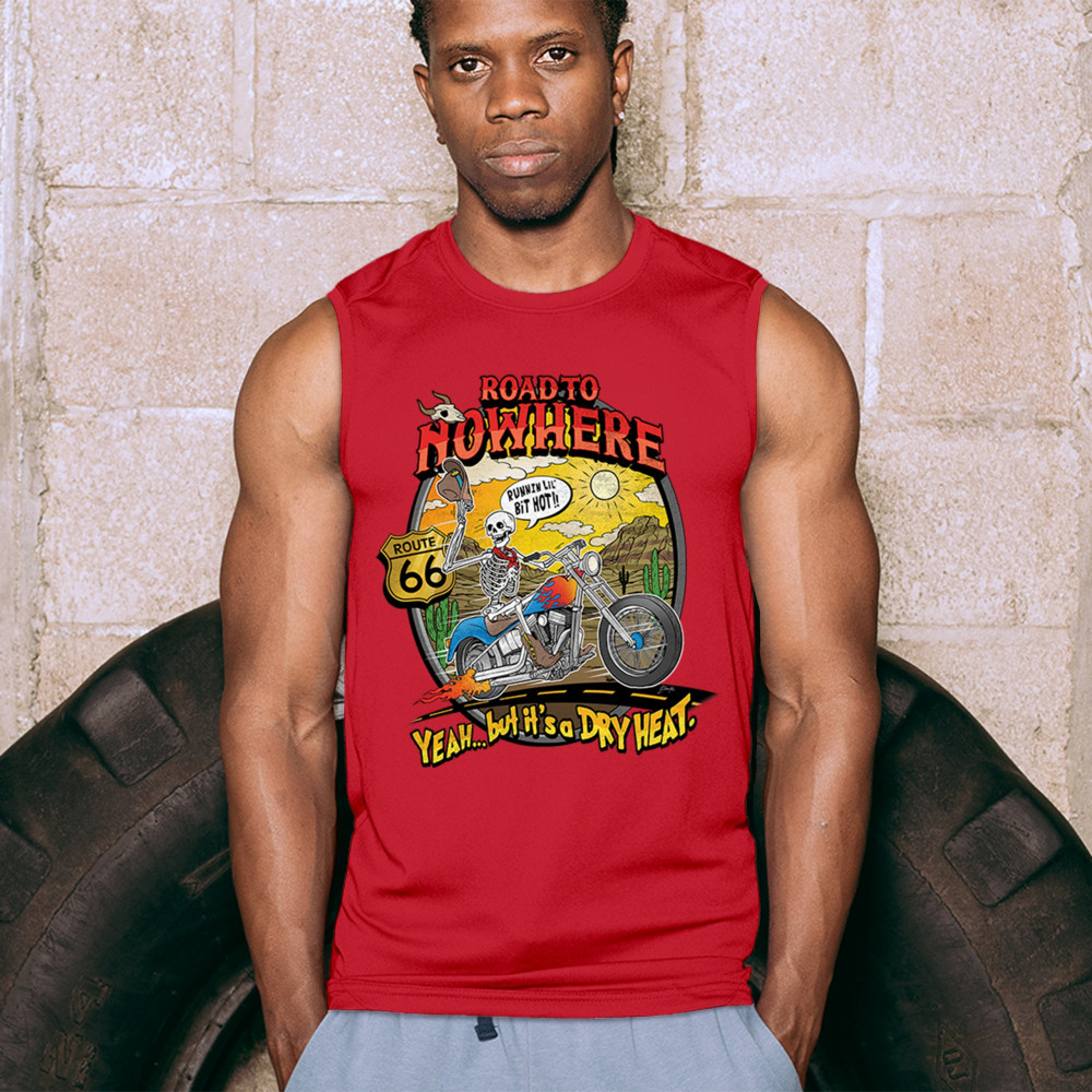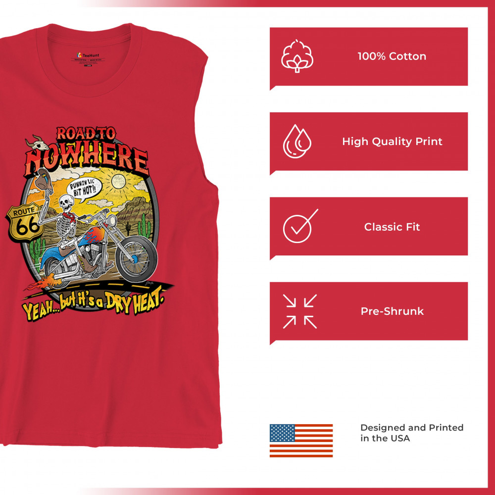 Discover the 'Road to Nowhere' T-shirt: a blend of bold graphics and adventurous spirit. Embrace the ride with our Route 66 skeleton biker design.