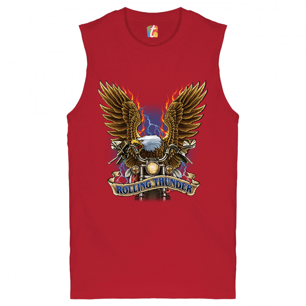 A print featuring an American bald eagle riding a motorcycle and spreading it's wings while they're on fire. In the background a lightning strikes. There is also stripe which says: "rolling thunder". A great choice for a motorcycle enthusiast.