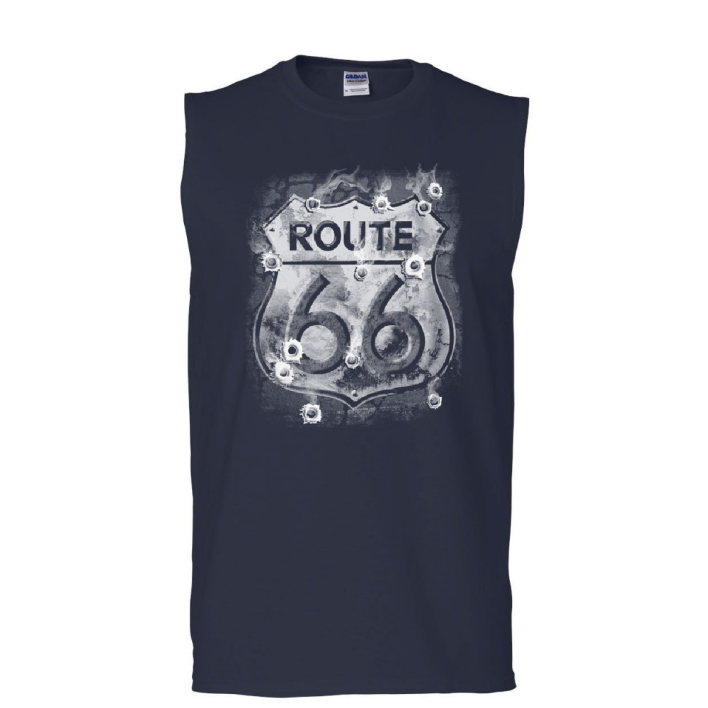 ROUTE 66 SIGN WITH BULLET HOLES route 66 muscle shirt bullet holes the mother road american highway sleeveless navy blue