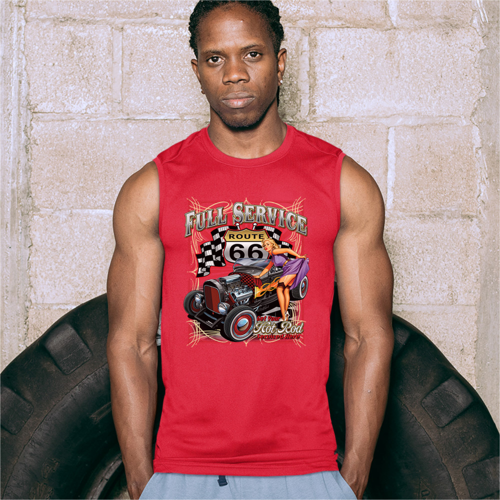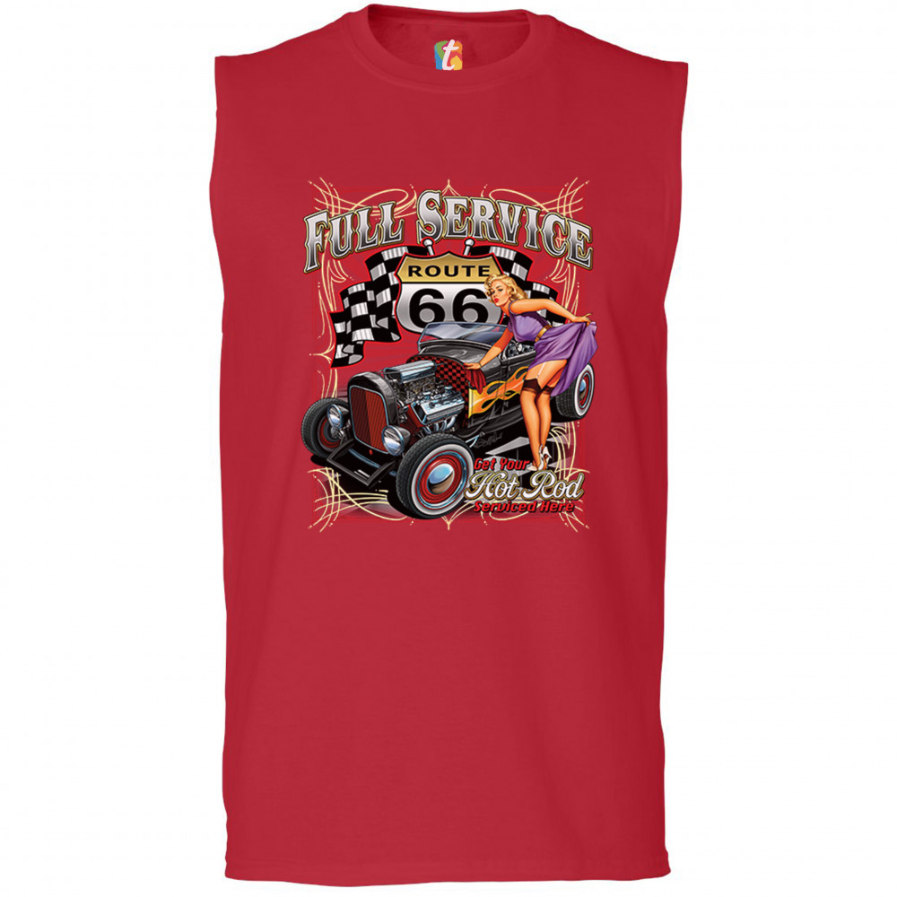 A print featuring a hot rod muscle car with flames painted on it's sides. There is a beautiful pin-up girl in stockings standing near it lifting her dress with one hand. The prints says: "full service" and "get your hot rod serviced here". In the background there is a Route 66 sign with racing flags to it's sides. Great for Route 66 and hot rod fans.