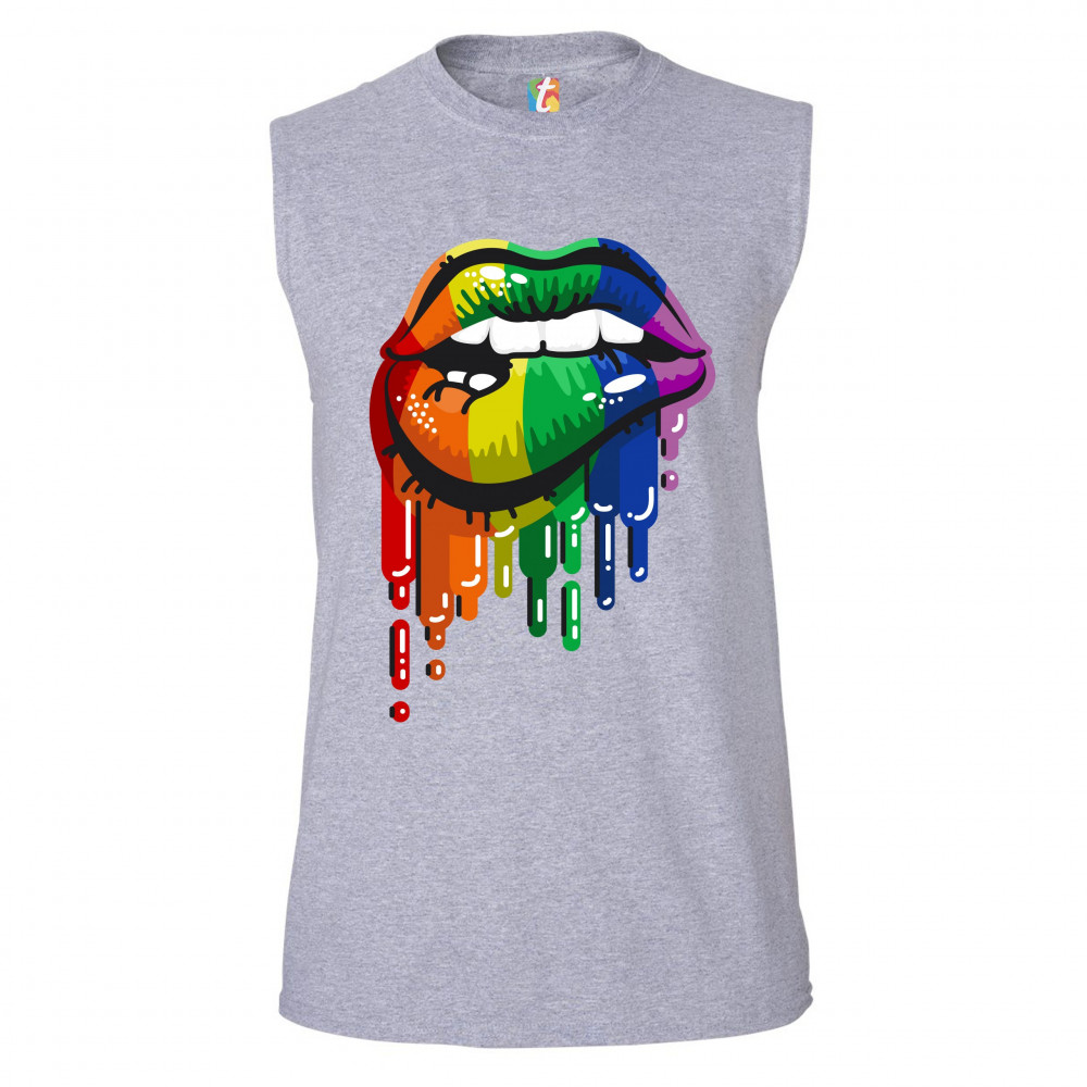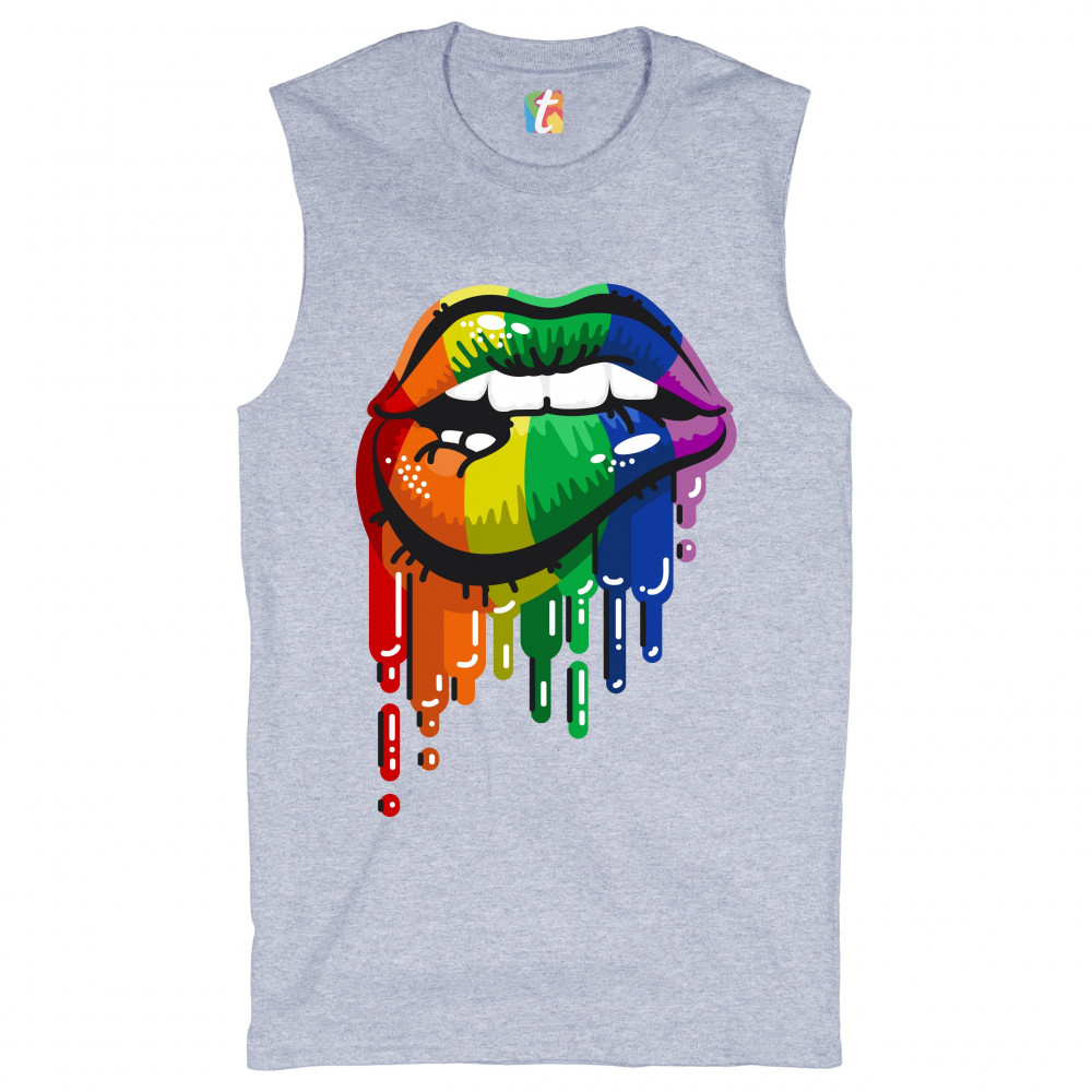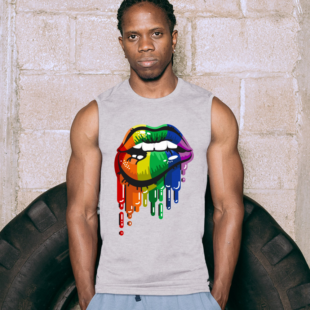 SEXY MELTING RAINBOW LIPS muscle shirt lgbt queer gay pride love wins men's gray