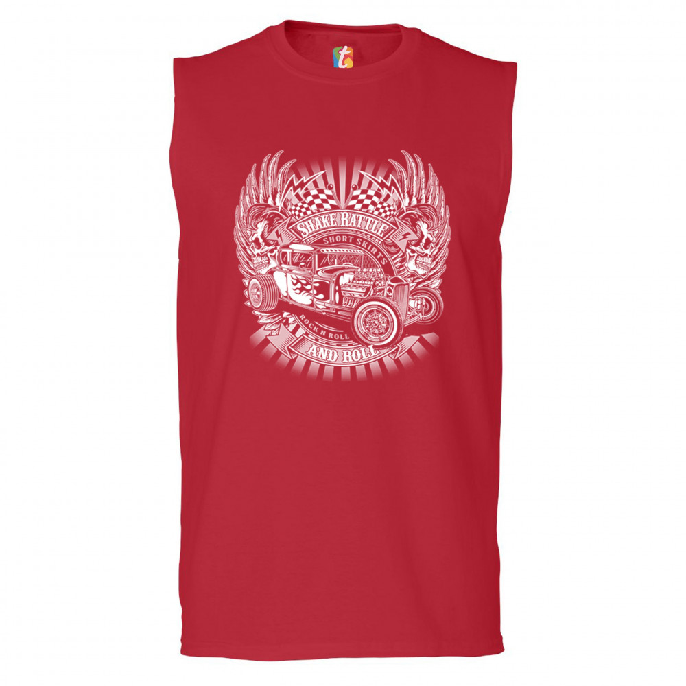 A print featuring a vintage hot rod with an exposed engine, a pair of skulls, wings and racing flags. On several stripes it says: "Shake rattle and roll", "short skirts" and "rock and roll". A great choice for a fan of customized American classic cars and