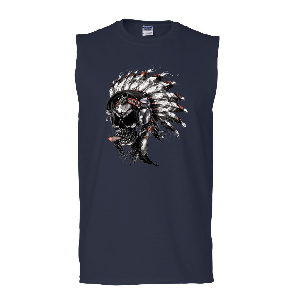 SKULL WITH INDIAN HEADRESS muscle shirt headphones cigar sleeveless navy blue